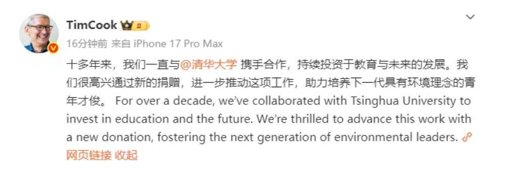 “我们很荣幸能在与清华大学长达十年的合作基础上更进一步,通过学术能力培养与实践经验赋能,助力学子们推动环境事业的发展。”Apple CEO Tim Cook表示,“新一代年轻人将如何运用创新与协作的力量让世界变得更美好,我们对此充满期待。” 据泡泡玛特公众号,10月13日,上海THE MONSTERS十周年巡展现场迎来一位特殊访客――苹果公司首席执行官蒂姆・库克。作为最新一次中国之行的首站活动,库克与泡泡玛特创始人王宁、LABUBU系列创作者龙家升进行了互动交流。 展览现场,三人一起参观了THE MONSTERS系列原创手稿和其他产品。龙家升还在iPad Pro上绘制LABUBU与库克的“同框合影”。参观结束时,王宁代表泡泡玛特向库克赠送了一份惊喜礼物。 今年是LABUBU诞生的十周年,为此,泡泡玛特举办了为期一年的全球巡回纪念展览,巡展首站落地上海。此次巡展公开了迄今为止数量最多的龙家升手稿和最完整的THE MONSTERS历代公仔。 值得关注的是,库克此次访华恰逢国内通信行业重要变革节点。10月13日晚间,国内三大运营商相继发布公告:中国联通、中国移动通过官方公众号宣布获得eSIM手机运营服务商用试验批复,中国电信则依据工信部许可文件,正式在全国31个省区市启动eSIM手机业务。 同在当日晚间,库克又现身抖音Apple Store官方直播间,宣布iPhone Air国行版将于10月17日上午9点开启预售,10月22日正式线下开售。 每日经济新闻综合苹果中国官网、泡泡玛特公众号、公开信息 封面图片来源:每日经济新闻 (责任编辑:董萍萍 )