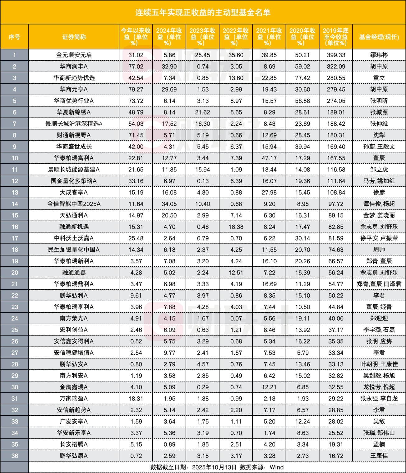 财联社10月14日讯(记者李迪)今年股市显著回暖,绩优产品也不断涌现。而回顾过去几年的市场低谷期,能连续多年实现年度收益为正的基金十分稀缺。 Wind数据显示,截至2025年10月13日,2020-2025年每年均实现正收益且2025年收益也为正的权益基金共有41只,包含5只被动型产品、36只主动型产品。 被动型产品的运作方式为被动跟踪指数,股市低谷期难以通过主动管理来控制回撤,因而数量较少。分主题看,上述连续五年实现正收益的被动型基金中,4只为红利低波主题产品,1只为煤炭主题产品。 而主动型产品则凭借基金经理的主动管理能力和回撤控制能力实现稳健收益。比如华商基金胡中原通过“行业分散+个股分散”来缓释组合波动;大成基金徐彦通过精选个股并偏投资低估值成长股来控制回撤。 基金经理出色的回撤控制能力可以帮助产品穿越周期,实现稳健的中长期业绩。而对于投资者来说,回撤控制优秀的产品能提供更好的持有体验,减少因短期波动造成的恐慌赎回,更有助于投资者坚持长期持有。 41只权益基金连续五年实现正收益,灵活配置型产品占大多数 Wind数据显示,截至今年10月13日,在2020年至2025年的五年间每年均实现正收益且今年收益也为正的权益基金共有41只。 上述产品包含5只被动型产品和36只主动型产品。 被动型产品的运作方式为被动跟踪指数,在股市低谷期难以通过主动管理来控制回撤,因而连续五年实现正收益的被动型权益基金数量较少。 分主题类型来看,连续五年实现正收益的被动型产品中,红利低波主题产品有4只,煤炭主题产品有1只。 ![]() 主动型产品方面,36只产品通过基金经理的主动管理能力实现连续五年收益为正。分类型来看,这些产品中32只为灵活配置型产品,3只为偏股混合型产品,1只为普通股票型产品。 灵活配置型产品的权益仓位调整灵活度更高,因而在股市低谷期能更好地通过降低仓位来控制回撤,因而这类产品在连续五年实现正收益的产品中占据绝大多数。 ![]() 分基金公司来看,上述连续五年实现正收益的主动权益基金中,华商基金旗下基金数量最多达5只,分别是华商润丰A、华商新趋势优选、华商元亨A、华商优势行业A、华商盛世成长。 此外,华泰柏瑞基金旗下产品数量排名第二,共有4只上榜,而鹏华基金、安信基金旗下分别有3只基金上榜。 从单只产品来看,上述连续五年实现正收益的基金中,多只产品中长期收益可观。 2019年末至今年10月13日之间,金元顺安元启的回报达399.33%,接近4倍;华商润丰A在该期间的收益也超过三倍,达322.09%。 优秀回撤控制能力创造多年正收益 即便在过去几年的股市低谷期,上述主动管理型产品依旧能实现正收益,这些业绩表现与基金经理的主动管理能力和回撤管理能力是分不开的。 以华商润丰灵活配置混合A为例,该产品自2019年3月以来由基金经理胡中原单独管理。2019年底至今,该基金实现322.08%的收益。 据悉,胡中原投资时以“风险收益比为第一要义”,他的组合管理坚持双重分散原则,采取“行业分散+个股分散”策略,显著缓释组合的整体波动。 此外,由胡中原管理的华商元亨A也连续五年实现正收益,且2019年年末以来的收益高达279.45%。 再以大成睿享A为例,该基金自2019年年底以来由基金经理徐彦单独管理,2019年底至今该基金实现收益达108.84%。 该产品的基金经理徐彦同样重视回撤管理。从历史数据来看,徐彦的产品换手率较低且回撤控制相对较好。他是价值型投资者,擅长精选个股,组合偏向投资低估值成长股。 业内人士指出,基金经理的出色回撤控制能力,有望帮助产品穿越周期,实现稳健的中长期业绩。如果产品在市场低谷期能做到少跌或者不跌,又在市场行情回暖时适当抓住收益,哪怕一两年内业绩不突出,但中长期业绩会排名靠前。 此外,对于投资者来说,回撤控制较好、熊市时也能实现正收益的产品也能为投资者带来更好的持有体验。如果一只权益产品的净值波动较大,投资者可能会恐慌性赎回,难以坚持长期持有。而对于回撤控制较好的产品来说,投资者的持有心态会更好,避免因短期波动而频繁操作,更有望通过长期持有来获得更多收益。 |