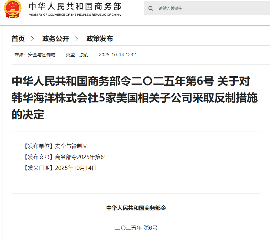 格隆汇10月14日|商务部公告,美国对中国海事、物流和造船业开展301调查并采取措施,严重违反国际法和国际关系基本准则,严重损害中国企业合法权益。韩华海洋株式会社在美相关子公司协助、支持美国政府相关调查活动,危害我国主权、安全、发展利益。依据有关规定,经国家反外国制裁工作协调机制批准,中方决定将韩华海洋株式会社5家美国相关子公司Hanwha Shipping LLC、Hanwha Philly Shipyard Inc.、Hanwha Ocean USA International LLC、Hanwha Shipping Holdings LLC和HS USA Holdings Corp.列入反制清单,并采取以下反制措施:禁止我国境内的组织、个人与其进行有关交易、合作等活动。