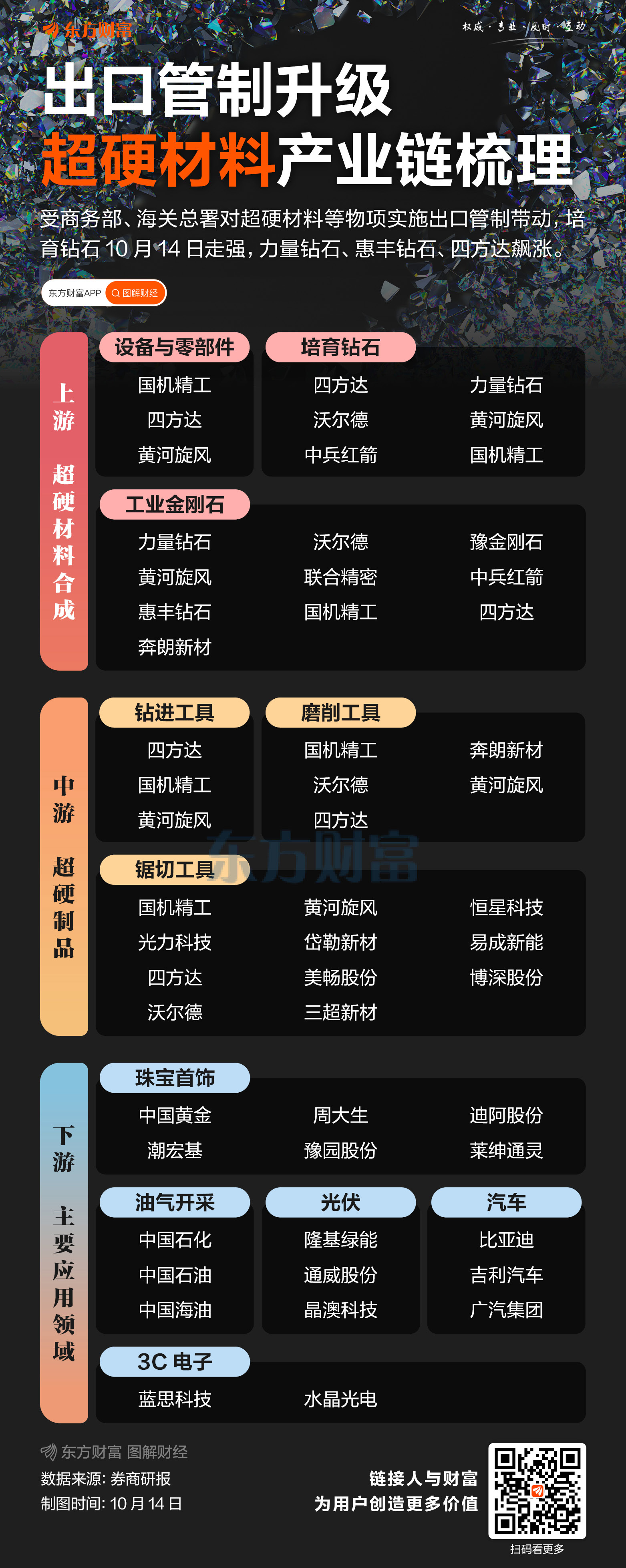 出口管制升级!超硬材料产业链梳理 在丁冬财经看资讯行情,选丁冬财经证券一站式开户交易>> ![]() 培育钻石板块在10月14日表现强势,当天收盘时黄河旋风涨停;力量钻石、惠丰钻石、四方达大涨超10%。 消息面上,日前商务部会同海关总署发布关于对超硬材料、稀土设备和原辅料、钬等5种中重稀土、锂电池和人造石墨负极材料相关物项实施出口管制措施的公告,将于11月8日正式实施。中信证券表示,此次出口管制范围相比2024年8月扩大,进一步凸显超硬材料的战略属性。 公开信息显示,超硬材料主要是指金刚石(包括天然金刚石和人造金刚石)和立方氮化硼。河南省工信厅数据则显示,人造金刚石在全球工业用超硬材料中的应用占比超过90%。因此,金刚石及其制品是主要的超硬材料。 中原证券表示,若是按应用领域来看,人造金刚石可分为用于制造业领域的工业金刚石(中兵红箭、豫金刚石、惠丰钻石等)、用于消费领域的培育钻石(四方达、力量钻石、中兵红箭等)两大类。而从技术手段来看,人造金刚石的合成方法主要为高温高压法(HTHP,中兵红箭、黄河旋风等)和化学气相沉积法(CVD,四方达、国机精工等)。 至于下游应用,中原证券表示,主要方向包括消费电子(蓝思科技等)、光伏(隆基绿能等)、油气开采(中国石油等)、珠宝首饰(迪阿股份、豫园股份等)、军工、半导体等领域。 中原证券表示,在世界复苏乏力、外需减弱的背景下,传统超硬材料和制品需求承压,出口呈现量增价减,超硬材料行业进入下行周期。而随着技术不断演进突破,功能性金刚石在半导体、军工、光学应用也初步显露出实用化趋势,产业化序幕徐徐拉开。未来,随着功能性金刚石技术的成熟,将为超硬材料企业开拓一片崭新的蓝海。