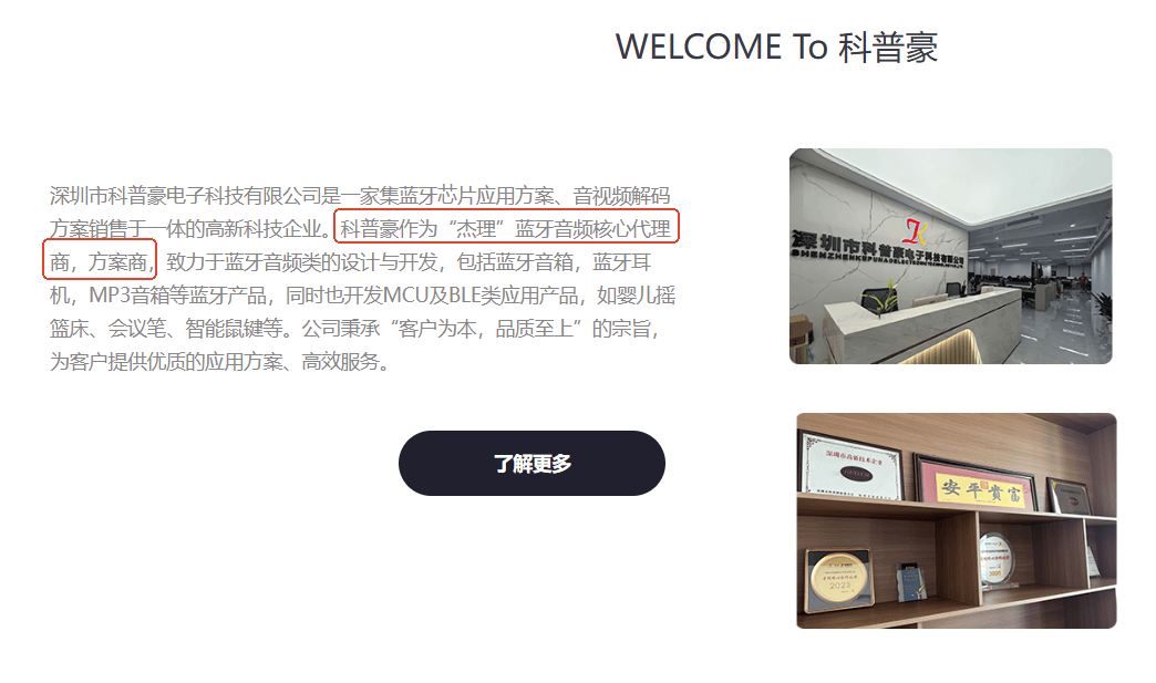 不难看出,杰理科技的销售路径中,一般由方案商结合特定需求和产品功能进行二次开发,再销售给板卡厂商、整机厂商。 然而,杰理科技在披露主营业务收入按销售模式分类时,称“不适用”。 前次上市,杰理科技的销售模式也受到关注。 据杰理科技创业板签署日为2022年5月29日的首轮问询回复,杰理科技被深交所问及其经营模式披露的准确性,要求杰理科技说明其招股说明书披露的销售模式与实际情况是否明显不符;说明方案商或具备芯片二次开发能力的整机厂商的具体含义,杰理科技是否具备二次开发的能力,其客户是否实质为经销商或代理商等。 对此,杰理科技回复称产品销售模式均为直销,不属于经销商或代理商销售。同时,杰理科技称其主要方案商客户并非简单从事经销或代理业务,且具备技术实力,不属于经销商或代理商。 而此番上市,据签署于2025年5月16日的首轮问询回复,北交所关注到杰理科技的方案商结合板卡厂商及整机厂商的特定需求等进行二次开发后提供给下游客户,要求其补充说明销售模式,以及销售模式披露的准确性及产品终端投入使用情况等。 对此,杰理科技回复称,其客户结构中不存在简单从事经销或代理业务的经销商或代理商,并且将方案商、板卡厂商、整机厂商均认定为直销或终端客户。 报告期内即2022-2024年,杰理科技的客户主要为方案商、少量板卡厂商和少数整机厂商,其中方案商和板卡厂合计销售金额占主营业务收入比例约 99%,整机厂商收入占比约1%。同期,杰理科技的前十大客户共12家,其中11家为方案商,1家为板卡厂商。 由上可知,杰理科技称其销售模式为直销,并且其方案商等客户不属于经销商或代理商。 然而,杰理科技的方案商客户或存在自称系杰理科技核心代理商的情形。 2.2 大客户官网自称系“杰理”核心代理商,另外两家客户自称系杰理科技的一级代理 据签署于2025年5月16日的首轮问询回复,杰理科技将深圳市科普豪电子科技有限公司(以下简称“科普豪”)披露为方案商客户。2022-2024年,杰理科技对科普豪机及其关联方的销售金额分别为13,811.81万元、12,446.11万元、12,848.2万元。 蹊跷的是,科普豪自称杰理科技的核心代理商。 据科普豪官网,截至查询日2025年10月13日,科普豪系一家集蓝牙芯片应用方案、音视频解码方案销售于一体的企业,并且作为“杰理”蓝牙音频核心代理商、方案商,致力于蓝牙音频类的设计与开发。
