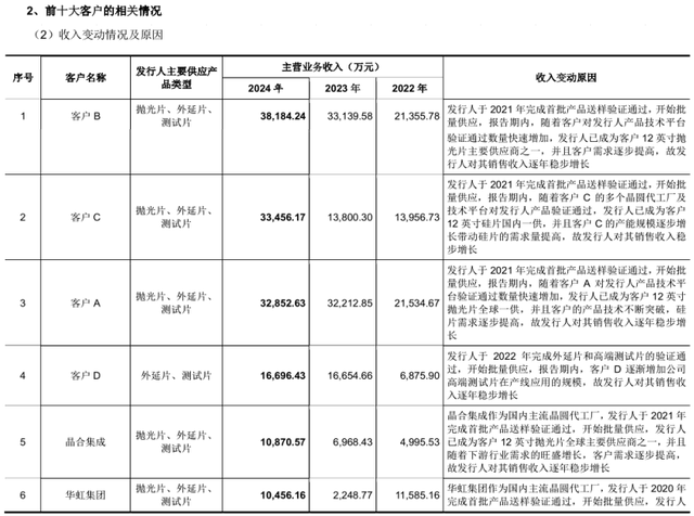 (截图来自招股书上会稿) 根据《上市公司收购管理办法》第八十三条,一致行动是指投资者通过协议、其他安排,与其他投资者共同扩大其所能够支配的一个上市公司股份表决权数量的行为或者事实。 今年5月,西安奕材的兄弟公司奕斯伟计算公示在港股IPO的申报材料。招股书披露,公司单一最大股东集团包括奕斯伟集团、北京奕理科技合伙企业(有限合伙,下称“奕理科技”)、北京奕想科技合伙企业(有限合伙,下称“奕想科技”)、奕明科技、王东升、米鹏、杨新元及刘还平。奕斯伟集团直接持有奕斯伟计算已发行股本总额的17.74%,且作为普通合伙人对员工持股平台奕理科技、奕想科技进行管理,两个持股平台分别持有12.72%、1.09%的股份。 奕明科技、米鹏、杨新元、刘还平分别持有奕斯伟集团52.40%、7.21%、4.32%、3.99%的股权。今年5月,王东升、米鹏、杨新元及刘还平订立协议,四人就奕斯伟集团董事会会议及股东会上的所有事项采取一致行动。而港股招股书中并未出现王辉的名字。 今年7月,证监会收到奕斯伟计算预计在香港联交所上市的备案信息,证监会要求奕斯伟计算补充说明“备案材料对控股股东认定结果不一致的原因及认定标准,并就控股股东的认定情况出具明确结论性意见”。 王辉的一致行动认定会不会出现在递表港交所的申报材料中,我们也将予以关注。 客户销售额分层统计矛盾,在手订单覆盖率数据错误 此外,西安奕材的信披也值得关注,部分数据相互矛盾。 招股书注册稿披露,累计研发费用投入前十的项目中,“立式研磨工艺技术开发项目”2022年至2024年的研发投入分别为509.72万元、352.02万元、141.49万元。公示的第一版招股书申报稿披露的报告期截至2024年前三个季度,上述研发项目在2024年1-9月的研发费用投入金额为143.60万元,要比2024年全年度的金额还多出2.11万元。 问询回复中关于客户销售规模的分层统计也出现前后矛盾。 首轮问询回复显示,2022年至2024年,西安奕材对客户销售收入在5,000万元以上的客户数量分别为5家、8家、11家。首轮问询回复还披露了同期前十大客户的销售情况,2022年至2024年这三个年度,西安奕材的前十大客户共有14家。从2023年的销售情况来看,前十大客户中,销售金额在5,000万元以上的客户分别为客户B、客户C、客户A、客户D、晶合集成、SVM、华立股份(603038),共计7家,比前面披露的数据少1家,对应的销售金额分别为33,139.58万元、13,800.30万元、32,212.85万元、16,654.66万元、6,968.43万元、6,889.12万元、5,517.36万元。