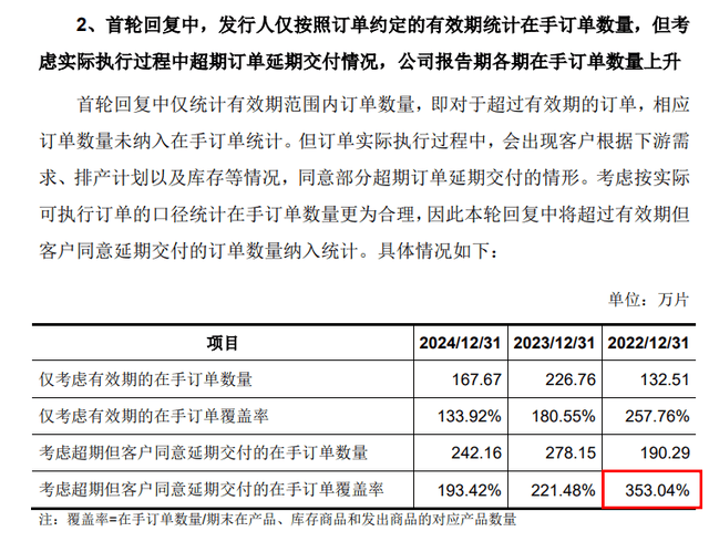 (截图来自二轮问询回复) 二轮问询中,西安奕材披露的同期在手订单数量分别为190.29万片、278.15万片、242.16万片。西安奕材表示,造成数据差异的原因是,首轮问询回复中仅统计有效期范围内订单数量,二轮问询回复将超过有效期的订单数量纳入了在手订单统计。因为在订单实际执行过程中会出现,客户根据下游需求、排产计划以及库存等情况,同意部分超期订单延期交付。二轮问询回复披露的考虑超期但客户同意延期交付的在手订单各期覆盖率分别为353.04%、221.48%、193.42%。 《民商财经》研究发现,二轮问询回复中,2022年考虑超期但客户同意延期交付的在手订单覆盖率或出现披露错误。首轮问询回复中披露,2022年至2024年的存货数量(在产品、库存商品、发出商品的合计)分别为51.41万片、125.59万片、125.20万片,经计算,2022年的覆盖率为370.14%,非353.04%,而其余两个年度计算出的数据则与二轮问询回复中披露的数据一致。 对于上述数据矛盾的情况,西安奕材和保荐机构中信证券(600030)应该给出解释。 本文首发于微信公众号:民商财经。文章内容属作者个人观点,不代表和讯网立场。投资者据此操作,风险请自担。 (责任编辑:宋政 HN002)