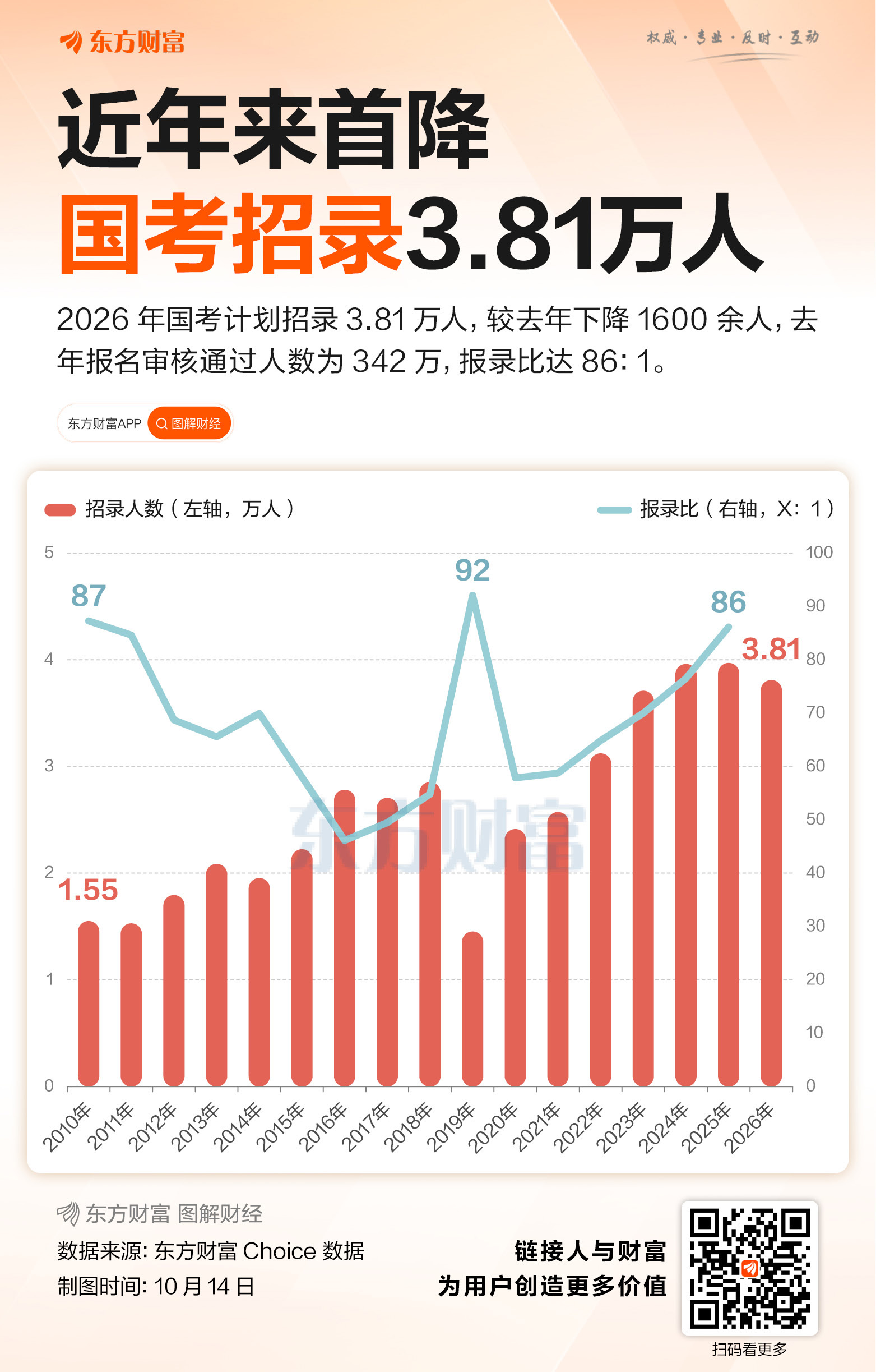 ![]() 据国家公务员局消息,2026年国考计划招录3.81万人,较去年减少1600余人,为近年来首次下降。此外,国考报考年龄限制发生变化,由之前的35周岁以下放宽至38周岁以下(应届硕博生由40岁放宽至43岁),这是自1994年发布《国家公务员录用暂行规定》以来首次发生变化。 东方财富Choice数据显示,2019年至2025年国考招录人数从1.45万人增长到3.97万人,增长了74%,2026年为近年来首次下降。 在报名人数方面,2025年国考报名审核通过人数达342万人,是2019年134万人的2.55倍。不过由于2019年国考仅招录1.45万人,导致报录比高达92:1,而2025年招录3.97万人,报录比为86:1。 具体到招录计划,应届生在国考招录中的占比继续保持在较高水平。今年中央机关直属的市(地)级及以下机构主要招录应届高校毕业生,设置约2.6万个计划,服务和促进高校毕业生就业。 此外,今年录用政策、录用计划延续了向基层一线倾斜的趋势,有2.8万余个计划补充到县(区)级及以下直属机构,3000余个计划定向招录服务基层项目人员和在军队服役5年以上的高校毕业生退役士兵,对艰苦边远地区基层职位继续给予一定倾斜政策。