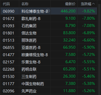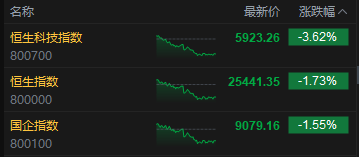 10月14日消息,港股三大指数高开低走。截至收盘,恒生指数跌1.73%,报25441.35点,恒生科技指数跌3.62%,国企指数跌1.55%。盘面上,科网股普跌,哔哩哔哩跌超7%,快手跌超6%,百度跌超5%,阿里巴巴跌超4%,联想跌超3%,腾讯、网易跌超2%,美团跌超1%;内银股逆市上涨,招商银行(600036)涨超4%;半导体板块跌幅居前,华虹半导体跌超13%;黄金股回调,赤峰黄金(600988)跌超6%;创新药概念普跌,石药集团跌超7%。