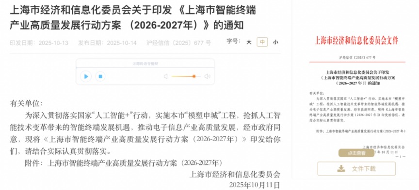 人工智能利好来了!上海重磅发布 专业金融数据,下一代智能终端 据上海市人民政府网站消息,上海市经济和信息化委员会日前印发《上海市智能终端产业高质量发展行动方案(2026—2027年)》(以下简称《行动方案》),其中提出,到2027年,上海市智能终端产业持续做大做强,总体规模突破3000亿元,打造3家以上具有全球影响力的消费级终端品牌,培育2家领军企业,实现三个“一千万”台规模,即人工智能计算机、人工智能手机、人工智能新终端规模各达到千万台以上。 《行动方案》提出,加强端侧人工智能芯片布局。围绕手机、计算机、眼镜等各类终端产品需求,加快SoC、CPU等核心芯片布局,覆盖X86、ARM、RISC—V等三大技术路线。依托服务器算力芯片能力,积极布局端侧GPU芯片发展。 ![]() 在终端核心产品打造行动方面,《行动方案》提到,推动人工智能计算机加快发展。培育人工智能计算机领军品牌,建设年产千万台产能生产基地,支持上海市传统计算机产能向人工智能计算机全面转型。推动人工智能计算机发展成为融合端侧大模型、分布式算力调度、多模态人机协作的下一代智能生产力中枢,构建“端—边—云”协同的智能算力网络的终端承载能力。 《行动方案》明确,提升智能算力终端规模。加快边缘智算一体机终端布局,开发支持大模型轻量化的推理一体机产品,打造即插即用人工智能边端解决方案,加速人工智能赋能千行百业。打造智算服务器终端产业集群,提升万卡集群系统调优能力,集聚国内智算服务器整机优质企业,实现百亿级规模,牵引自主GPU、互联模块等核心部件规模化应用。 《行动方案》提出,强化机器人终端能力。打造能听会道、有情商、有智商、有技能的人形机器人产品,支持人形机器人产品研发和量产制造,推进端侧芯片、灵巧手、电池等核心零部件加快产业化突破。推动工业机器人整零协同,聚焦关键零部件、高端整机等薄弱环节,补全产业链短板。加速机器人终端产品向消费级市场加速渗透,打造陪伴机器人、家庭机器人等消费级机器人产品。 《行动方案》还提到,培育卫星互联网终端产品。围绕低轨卫星星座部署和应用落地需求,持续探索和开拓业务场景,构建覆盖海洋、航空、应急等领域的终端体系。建设卫星终端智能产线,打造卫星终端上海品牌,加快形成十万级卫星终端整机生产规模能力和出货规模。 在终端关键技术筑基行动方面,《行动方案》提出了5条具体举措,其中包括,加强端侧人工智能芯片布局、提升端侧模型性能、推动软硬件协同创新、强化智能模组能力、促进下一代显示技术发展。 《行动方案》提到,围绕手机、计算机、眼镜等各类终端产品需求,加快SoC、CPU等核心芯片布局,覆盖X86、ARM、RISC—V等三大技术路线。依托服务器算力芯片能力,积极布局端侧GPU芯片发展。支持3D异构集成关键技术突破,探索新型存储技术路线,支持近存、存内计算技术发展,支撑芯片平台算力和功耗水平提升。 《行动方案》提出,支持智能终端用大模型发展,打造一批有竞争力的端侧模型产品。加快轻量化多模态端侧模型技术研发,推进蒸馏、剪枝、量化等模型压缩技术在端侧模型的应用。 《行动方案》强调,加强硬件与软件的协同调优,推动芯片、模型、终端企业深度合作,实现芯片架构与模型结构的跨层联调优化。促进端侧模型在各类终端中的应用部署,充分挖掘端侧硬件能力,大幅提升端侧模型实际运行效率和能效比。鼓励企业打造智能体平台,打通各类应用程序。支持轻量化、高兼容性的AI推理引擎,实现主流深度学习框架与端侧深度适配。 《行动方案》还提到,强化多模态感知能力,打通摄像头、麦克风、陀螺仪、雷达等多源信号,建立统一的智能传感器数据融合框架。推动集成端侧模型推理能力的边缘计算模组开发,赋能传统终端产品智能化能力。支持6G、卫星通信多频段融合模组研发,实现智能终端通信低延迟、高可靠、泛连接。围绕智能座舱、自动驾驶、智能底盘三大领域,支持汽车电子模组先进技术研发,提升汽车电子上游产业水平。 在产业生态环境优化行动方面,《行动方案》明确,提升金融对产业支撑力度。通过产业转型基金、先导基金等相关产业投资基金,加大对上海市终端企业融资支持。充分发挥国有资本母基金作用,引导社会资本、专业机构参与智能终端产业投融资,鼓励金融机构加强智能终端融资需求保障。发挥国有企业作用,支持各类企业积极参与智能终端产业发展,鼓励优质企业对关键环节开展并购收购。 《行动方案》还提到,加快形成产业集聚效应。深化市区协同,加快浦东新区、松江区、青浦区、临港新片区等智能终端重点区域发展。围绕智能终端上下游产业链,打造产业集聚区,加速汇聚一批具有竞争力的优质企业和创新企业,形成规模效应,带动全市智能终端产业规模突破。 想炒股,先开户!选丁冬财经证券,行情交易一个APP搞定>> (文章来源:券商中国) |