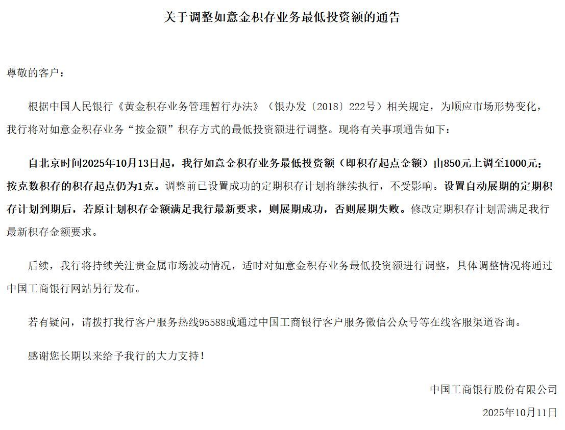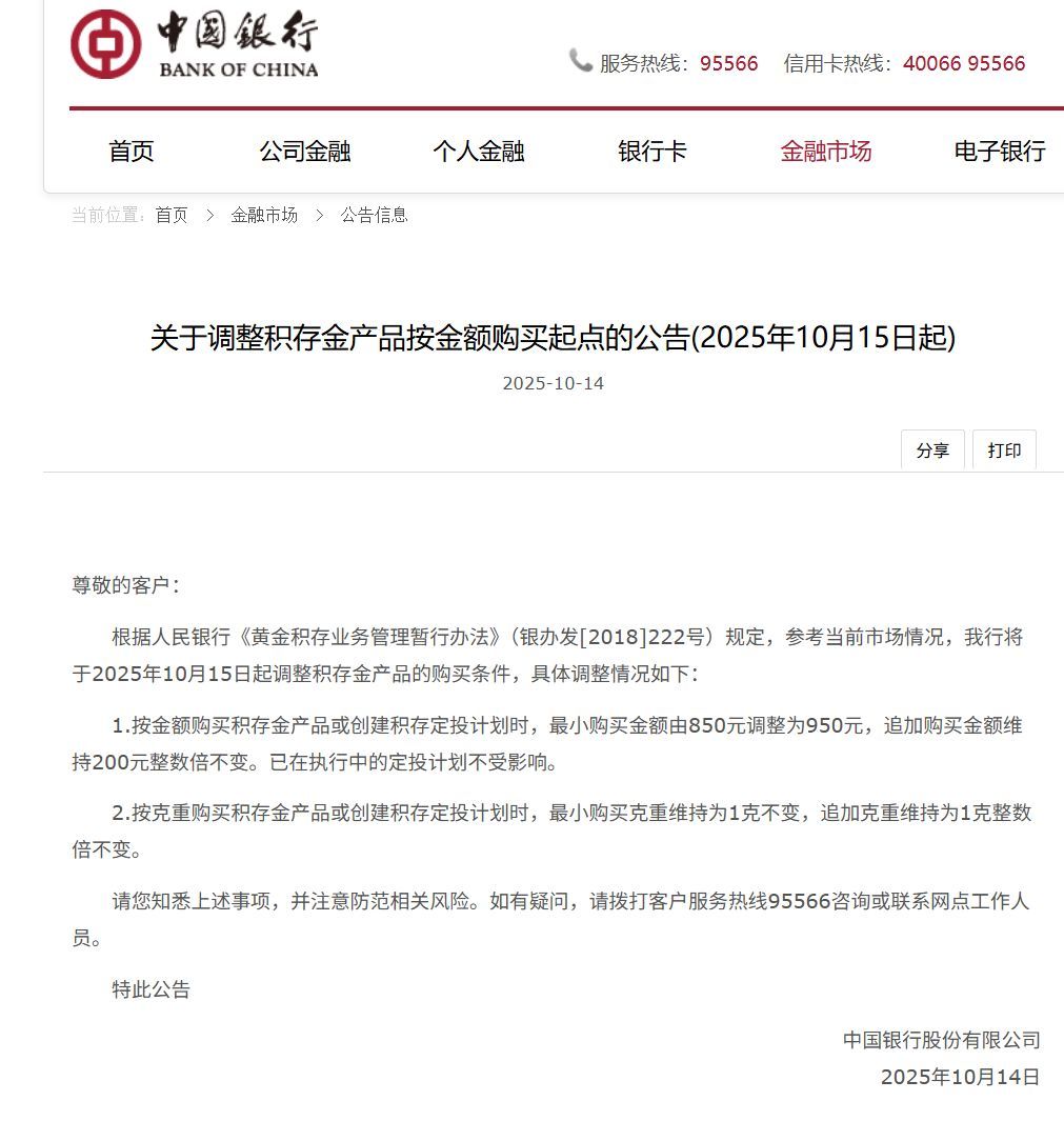 今年以来,贵金属的涨势主导了大宗商品市场,今年3月,金价突破了每盎司3000美元的关口,本月初突破4000美元,而10月14日再次创下新高,突破了每盎司4100美元。 截至10月15日发稿,现货黄金报4159.32美元/盎司。 近期,推动贵金属不断走高的原因是什么?华尔街又对未来的行情有何判断? 据央视财经,分析指出,目前黄金的交易热潮一部分是受到了美联储降息预期升温的支撑,当下,美国联邦政府仍在“停摆”,没有人能确定何时会结束,这意味着美国经济可能会受到冲击。 道明证券全球大宗商品策略主管巴特·梅莱克:这可能会促使美联储采取更激进的宽松政策,也意味着黄金的持有成本会下降,因此很多依靠个人判断进行操作的自营交易员,可能会更有信心入场布局黄金。 此外,全球央行的购金热潮以及黄金ETF持仓的增加,也助推贵金属走高。分析指出,目前无论是全球央行、机构投资者还是个人投资者,如今都出现了将部分原本配置在美国国债上的资金转向黄金的趋势。 全球资产管理公司Sprott首席执行官约翰·钱帕利亚:很重要的是,我们要思考,金价走高正在向市场传递什么信号,它反映出的基本上是高度的不确定性和风险,同时也折射出市场对美元长期美债,以及短期美债等资产的担忧,这些资产过去几十年来一直是全球主要的储备资产。 在这一背景下,当地时间10月13日,美国银行上调了对黄金和白银的价格预测,成为华尔街首家将2026年黄金价格预测上调至每盎司5000美元、白银价格预测上调至每盎司65美元的大型银行。 美国银行指出,白宫“非传统的政策框架”将持续利好黄金,而包括美国财政赤字扩大、债务上升等因素也将推动金价明年继续走高。另外,美银分析认为:白银即将迎来连续第五年的结构性供应短缺,供应紧张或支撑银价。 据央视财经,多家银行也提醒,目前黄金和白银都出现了超买迹象,投资者应保持警惕。 10月10日,建设银行发布公告称,近期国内外贵金属价格波动加剧,市场风险提升。请投资者提高贵金属业务的风险防范意识,合理控制仓位,及时关注持仓情况和保证金余额变化情况,理性投资。 ![]() 图片来源:建设银行 分析人士还指出,短期内白银面临更大的调整风险,随着流动性增加和需求放缓,价格可能会出现波动。 值得注意的是,多家银行发布关于调整积存金产品按金额购买起点的公告。 10月14日,中国银行发布关于调整积存金产品按金额购买起点的公告。将于2025年10月15日起调整积存金产品的购买条件,具体调整情况如下: 1、按金额购买积存金产品或创建积存定投计划时,最小购买金额由850元调整为950元,追加购买金额维持200元整数倍不变。已在执行中的定投计划不受影响。 2、按克重购买积存金产品或创建积存定投计划时,最小购买克重维持为1克不变,追加克重维持为1克整数倍不变。 ![]() 图片来源:中国银行官网 此前10月11日,工商银行网站发布通告,为顺应市场形势变化,我行将对如意金积存业务“按金额”积存方式的最低投资额进行调整:自北京时间2025年10月13日起,该行如意金积存业务最低投资额(即积存起点金额)由850元上调至1000元;按克数积存的积存起点仍为1克。 ![]() 图片来源:工商银行 另据媒体报道,10月14日14点30分,记者发现,支付宝工商银行积存金目前不可开户,提示原因为系统维护暂不可开户。 积存金是银行发行的黄金产品,目前只有工商银行积存金可以通过支付宝买入。产品相关通知显示,自2025年8月28日起,蚂蚁财富工银积存金客户通过主动积存方式买入工银积存金可享受0手续费优惠,卖出交易手续费维持不变,为交易金额的0.5%(单笔最低手续费为0.01元),优惠活动截止日期为2025年11月8日。