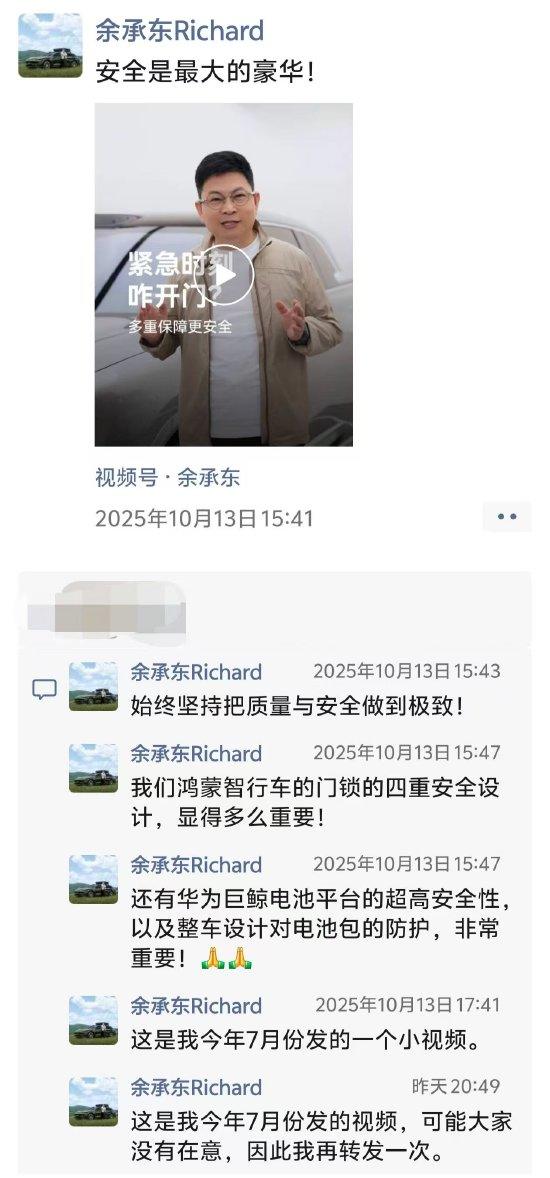 丁冬科技讯 10月15日下午消息,近日,华为常务董事、终端BG董事长余承东在朋友圈发文强调,“安全是最大的豪华!”配文下方,他还引用了今年7月发布的一个紧急时刻如何开车门的视频。 该视频演示了紧急时刻下,如何在鸿蒙智行车内打开车门。同时,他还提到了碰撞解锁冗余模块,展示了鸿蒙智行车在门锁安全上的设计。余承东在视频中强调,对于安全,备份再多也不嫌多。 在评论区,他进一步补充道,“始终坚持把质量与安全做到极致!我们鸿蒙智行车的门锁的四重安全设计,显得多么重要!还有华为巨鲸电池平台的超高安全性,以及整车设计对电池包的防护,非常重要!”