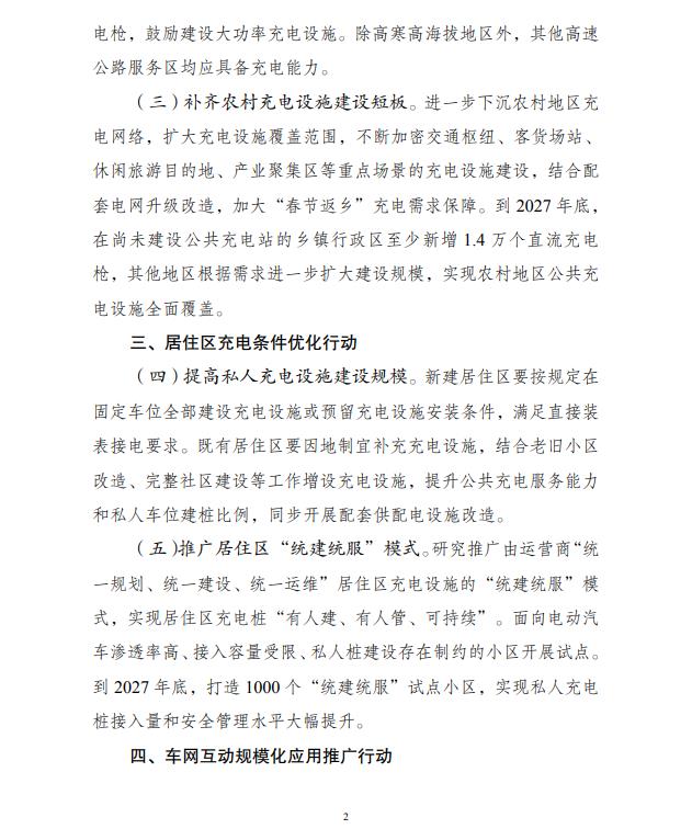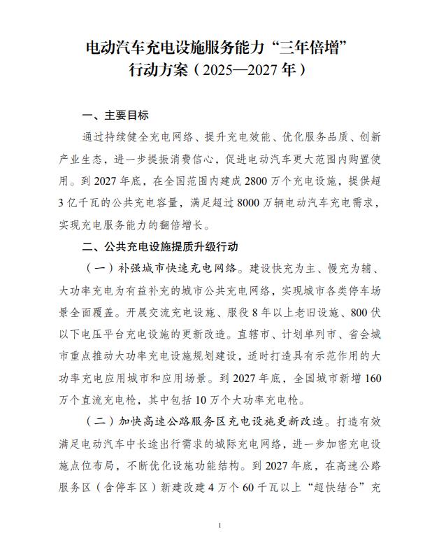 国家发改委等部门印发《电动汽车充电设施服务能力“三年倍增”行动方案(2025 专业金融数据,下一代智能终端 为落实《提振消费专项行动方案》有关要求,加大力度完善电动汽车充电设施服务网络,提升消费品质,促进电动汽车更大范围内购置使用,国家发改委等部门印发《电动汽车充电设施服务能力“三年倍增”行动方案(2025-2027年)》。其中提到,通过持续健全充电网络、提升充电效能、优化服务品质、创新产业生态,进一步提振消费信心,促进电动汽车更大范围内购置使用。到2027年底,在全国范围内建成2800万个充电设施,提供超3亿千瓦的公共充电容量,满足超过8000万辆电动汽车充电需求,实现充电服务能力的翻倍增长。 ![]() ![]() ![]() ![]() ![]()