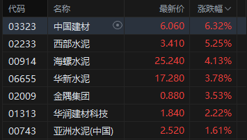 建材水泥股涨幅居前,中国建材涨超6%。中国建材预计前三季度净利润29.50亿元,同比扭亏为盈。主要由于水泥和商品混凝土等产品销售成本下降,应占联营公司利润上升。申万宏源发布研报称,三季度是水泥行业传统淡季,2025年水泥价格前高后低。泥出海布局持续有进展,华新水泥、西部水泥产能投放持续,非洲水泥盈利有望在高位且持续改善。