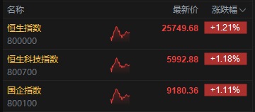 10月15日消息,港股三大指数集体上涨。截至午间收盘,恒生指数涨1.21%,报25749.68点,恒生科技指数涨1.18%,国企指数涨1.11%。盘面上,科网股普涨,哔哩哔哩涨超3%,阿里巴巴、联想涨超2%,小米、京东涨超1%;建材水泥股涨幅居前,中国建材涨超6%;新消费概念普涨,老铺黄金涨超6%;航空股活跃,东方航空涨超5%;轩竹生物上市首日涨超128%。