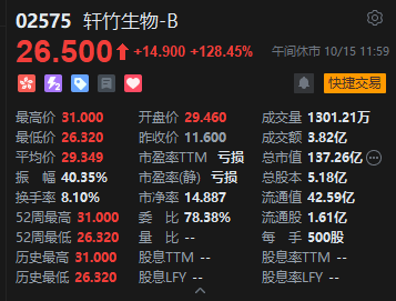 轩竹生物上市首日涨超128%。公开发售阶段轩竹生物获约4908.33倍超额认购,共接获近37.60万份有效申请。由于认购倍数极高,公开发售股份最终数目为673.35万股,占全球发售股份总数的约10%。申购一手的投资者获配发股份的几率极低,中签率仅为1%。国际配售部分同样获得超额认购,倍数约为10.15倍。