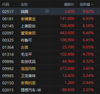 新消费概念普涨,老铺黄金涨超6%。国泰海通证券此前指出,当前我国外部环境面临更大扰动,提振内需消费的重要性和必要性日益凸显,政策支持下消费对经济的拉动作用有望强化。尽管当前港股新消费部分领域短期略显过热,但居民消费更加注重个性化和理性化的宏观趋势并未改变,该行预计悦己和性价比相关消费或延续增长趋势,如潮玩、美护、宠物等。