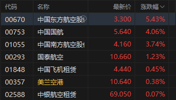 航空股活跃,东方航空涨超5%。国信证券发布研报称,四季度进入出行淡季,去年同期公商务出行需求相对较弱,今年同比或有一定修复。未来运力供给增速放缓确定性增强,若出行需求能保持稳增,带动航司座收持续修复,有望带来航司业绩高弹性;叠加油价中枢下行、汇率稳定等,航司利润向上空间可期。