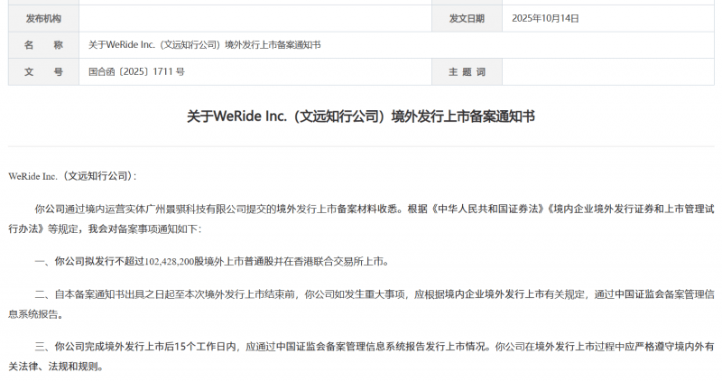 2025年10月14日,证监会正式对外宣布:全球领先的自动驾驶科技公司文远知行拟发行不超过102,428,200股境外上市普通股并在香港联合交易所获得备案。