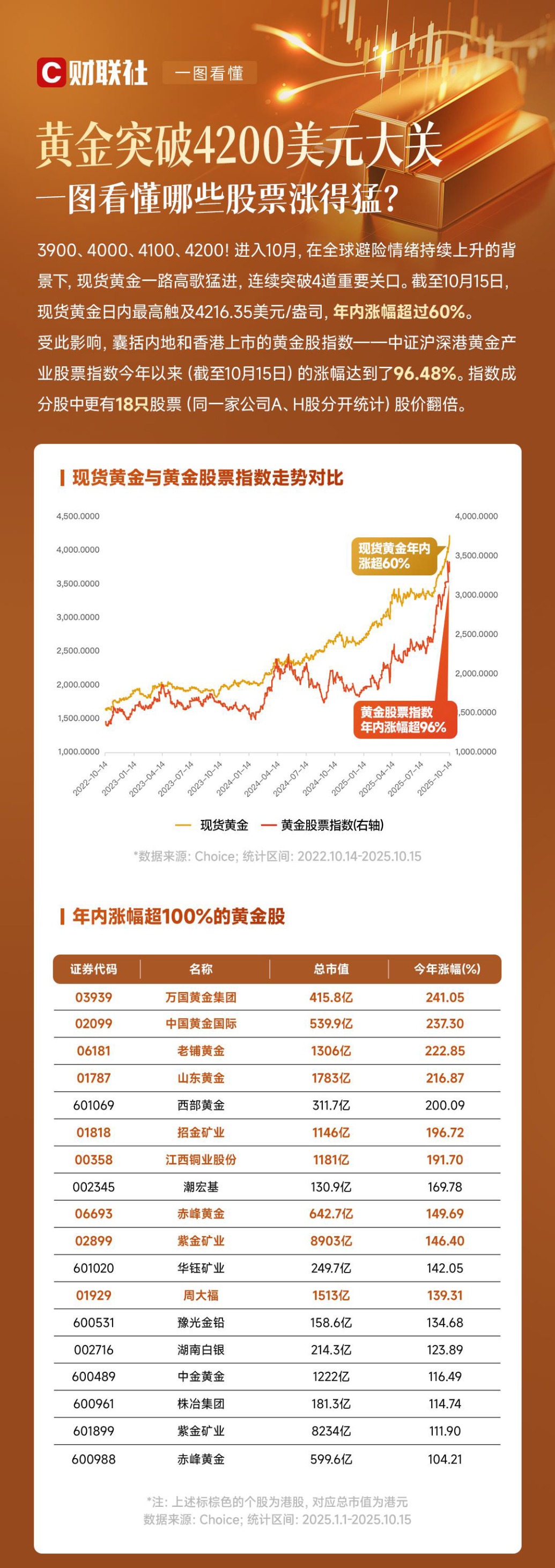 ①10月15日,现货黄金突破4200美元关口,年内涨幅超过60%。②中证沪深港黄金产业股票指数年内涨幅达96.48%,成分股中18只股票股价翻倍。