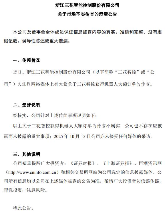 三花智控公告,近日,公司关注到网络媒体上有大量关于三花智控获得机器人大额订单的传言。经核实,公司针对上述传闻事项说明如下:以上关于三花智控获得机器人大额订单的传言不属实;公司也不存在应披露而未披露的重大事项;2025年10月15日公司亦未接受任何媒体的采访。