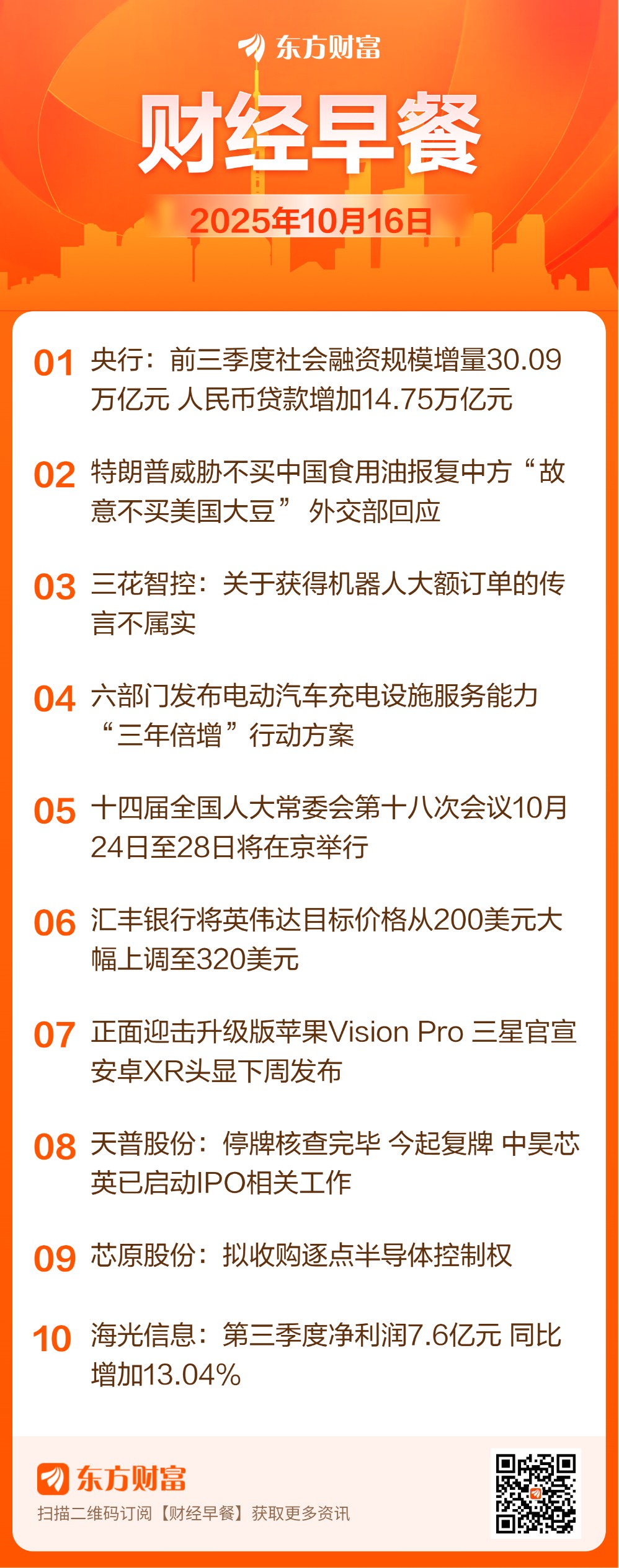 ![]() 每日精选9月金融数据: 15日,人民银行公布9月金融数据。数据显示,2025年9月末社会融资规模存量为437.08万亿元,同比增长8.7%。其中,对实体经济发放的人民币贷款余额为267.03万亿元,同比增长6.4%。值得关注的是,2025年前三季度,社会融资规模增量强劲,累计为30.09万亿元,同比多增4.42万亿元。9月末,广义货币(M2)余额335.38万亿元,同比增长8.4%。9月末,人民币贷款余额270.39万亿元,同比增长6.6%。 9月末,狭义货币供应量(M1)同比增长7.2%,增速比今年2月末的年内低点(0.1%)提升了7.1个百分点。M1增速上行也带动M1-M2剪刀差继续收窄为-1.2%,反映出企业生产经营活跃度提升、个人投资消费需求回暖等积极信号。 外交部答记者问: 10月15日,外交部发言人林剑主持例行记者会。以下为部分记者问答: 有记者问:据报道,美国总统特朗普指责中方故意停止进口美国大豆,并表示作为报复措施,将停止从中国进口食用油。请问中方对此有何评论? 答:中方在处理中美经贸问题上的立场是一贯的、明确的,贸易战、关税战没有赢家,不符合任何一方利益,双方应在平等、尊重、互惠的基础上协商解决有关问题。 有记者问:美国贸易代表格里尔表示,对中国商品加征100%关税无论是在11月1日还是更早生效,都取决于中国的做法。他还表示,中国官员对最新的稀土出口限制发表了相互矛盾的声明。外交部对此有何回应? 答:中方的主管部门已经就稀土出口管制的政策阐明了立场,中国依法对相关的物项实施出口管制,目的是更好地维护地区与世界的和平与稳定,履行防扩散等国际义务,这也符合国际惯例。中方的立场一以贯之,清清楚楚。倒是美方一边要谈,一边威胁恐吓,加征高额关税,出台新的限制措施,这不是与中方打交道的正确之道。我们敦促美方尽快纠正错误的做法,在平等、尊重、互惠的基础上,通过对话协商解决有关问题。 有记者问:据报道,欧盟正考虑迫使中国公司向欧洲公司移交技术,以便在当地运营,这是一项新的措施,旨在使欧盟行业更具竞争力,中方对此有何回应? 答:作为原则,中方支持中欧企业基于市场原则开展贸易投资合作,实现互利共赢,反对违反世贸组织规则,强制技术转让,反对干预企业的正常生产经营活动,反对以提升竞争力为名,采取保护主义歧视性做法。 电车充电设施: 10月15日下午,国家发展改革委官网显示,国家发展改革委、国家能源局、工业和信息化部等六部门发布关于印发《电动汽车充电设施服务能力“三年倍增”行动方案(2025—2027年)》。方案提到,到2027年底,在全国范围内建成2800万个充电设施,提供超3亿千瓦的公共充电容量,满足超过8000万辆电动汽车充电需求,实现充电服务能力的翻倍增长。 9月居民存款大增: 中国人民银行发布了2025年前三季度金融统计数据报告。报告显示,前三季度,我国住户存款增加12.73万亿元,最新数据报163.98万亿元;非银行业金融机构存款增加4.81万亿元,最新数据报33.00万亿元。结合前八个月的数据计算,9月份,居民存款增加了2.96万亿元,同期非银行业金融机构存款下降了1.06万亿元。 全国人大常委会: 十四届全国人大常委会第十八次会议将于10月24日至28日在北京举行。委员长会议建议,十四届全国人大常委会第十八次会议审议国务院关于金融工作情况的报告、关于2024年度国有资产管理情况的综合报告和关于2024年度企业国有资产(不含金融企业)管理情况的专项报告、关于刑罚执行工作情况的报告等。 美联邦政府“停摆”继续: 当地时间10月15日,美国参议院以51票对44票的投票结果,再次未能推进共和党的临时拨款法案。据悉,需要60票才能推进这项将为政府提供资金直至11月底的法案。 三花智控传闻: 15日市场有传闻称,特斯拉已向中国供应商三花智控下达了价值6.85亿美元的Optimus线性执行器订单。三花智控15日晚公告称:近日关注到网络媒体上有大量关于公司获得机器人大额订单的传言,经核实,该传言不属实;公司也不存在应披露而未披露的重大事项;2025年10月15日公司亦未接受任何媒体的采访。 热点题材AI芯片: 当地时间10月14日,云服务供应商甲骨文(Oracle)和AMD宣布扩大合作,甲骨文将从2026年第三季度起在其数据中心中部署5万块来自AMD的InstinctMI450芯片,采用AMD的下一代“Helios”机架设计,并计划在2027年之后进一步扩大部署规模。 重卡市场: 中汽协最新发布的数据显示,今年9月,重卡市场月销量达10.6万辆,较去年同期大幅增长82.9%,连续六个月实现同比增长。“金九”行情的带动下,今年1-9月,全国重卡累计销量达82.1万辆,同比增长超过20%。 果链: 10月15日,工业和信息化部部长李乐成在北京会见美国苹果公司首席执行官蒂姆·库克,双方就苹果公司在华业务发展、加强电子信息领域合作等议题进行交流。库克感谢工业和信息化部对苹果公司在华发展的支持,表示将继续加大在华投资,进一步提高对华合作层次和水平,实现互利共赢发展。 人形机器人: 据智元机器人官微,智元精灵G2新品发布直播将于10月16日10:00-11:00举行。据悉,智元精灵G2前期将重点应用于平板产线,实现具身智能机器人在消费电子组装制造场景批量落地。 数据中心电源: 富士康日前在官网上宣布,公司正在与英伟达合作,推动800伏直流(800V DC)架构落地AI数据中心。这一新架构将首先在高雄K-1人工智能数据中心项目中实施,该项目作为展示平台,展现公司在AI服务器、数