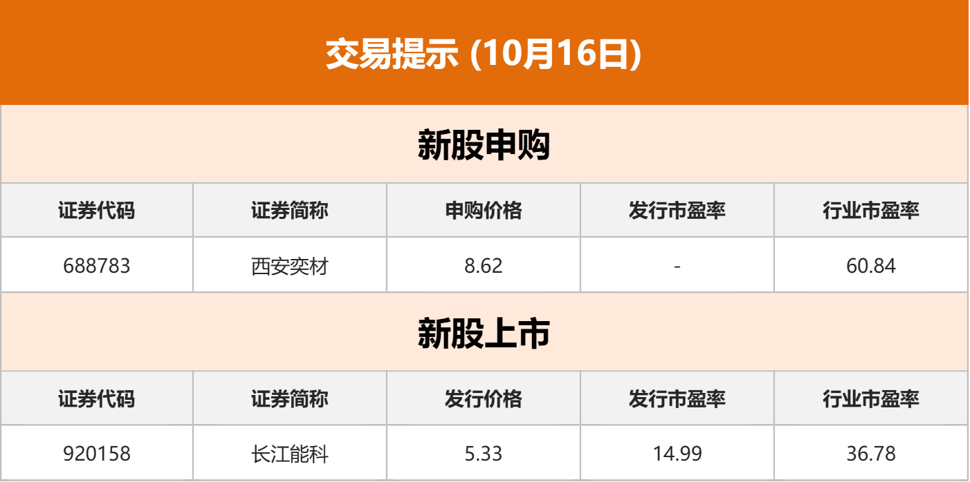 公司新闻天普股份:公司股票将于10月16日开市起复牌。经公司与收购方中昊芯英再次确认,截至目前,收购方中昊芯英已启动独立自主的首次公开发行股票(IPO)相关工作。收购方中昊芯英无资产注入计划。公司控制权变更事项存在不确定性。 英伟达:汇丰银行将英伟达评级从持有转为买入,将其目标价格从200美元上调至320美元。 中科曙光:2025年前三季度营业总收入88.04亿元,同比增长9.49%;归属于上市公司股东的净利润9.55亿元,同比增长24.05%。业绩增长主要由于公司优化产品结构、提供多样化解决方案及提升运营效率。 寒武纪:据商汤科技公众号消息,近日,商汤科技与中科寒武纪科技股份有限公司签署面向新发展阶段的战略合作协议,重点推进软硬件的联合优化,并共同构建开放共赢的产业生态。 硕贝德:预计归属于上市公司股东的净利润为4953.08万元—5153.08万元,比上年同期增长1258.39%-1313.24%。2025年第三季度盈利1600万元—1800万元,比上年同期增长2836.86%-3203.96%。 航天晨光:公司承制了目前国内最大的核聚变试验装置BEST关键部件杜瓦系统并于近日成功落位装配,保障了BEST项目的顺利推进。 海光信息:公司第三季度营业收入40.26亿元,同比增长69.6%,前三季度营业收入94.9亿元,同比增长54.65%;第三季度归属于上市公司股东的净利润7.6亿元,同比增长13.04%,前三季度净利润19.61亿元,同比增长28.56%。 芯原股份:公司拟联合共同投资人对天遂芯愿进行投资,并以天遂芯愿为收购主体,以9.3亿元现金加上交易费用等相关费用收购逐点半导体97.89%股份。交易完成后,天遂芯愿将持有逐点半导体100%的股份,逐点半导体纳入公司合并报表范围。公司于2025年10月设立本次收购的收购主体天遂芯愿,并拟引入一家或多家共同投资人对天遂芯愿进行投资,预计公司将按照40%的股权比例对天遂芯愿进行出资和增资。 凯美特气:公司主要产品有高纯二氧化碳、氢气、液化气、戊烷、电子特气等。电子特气产品可用于半导体等领域。公司产品目前未应用于核聚变领域。 光华科技:公司第三季度实现营业收入7.62亿元,同比增长14.99%;归母净利润3412.57万元,同比增长962.19%。前三季度归母净利润9039.34万元,同比增长1233.7%。 美年健康:预计前三季度归属于上市公司股东的净利润4200万元—6200万元,同比增长70.51%–151.7%。营业收入68.5亿元—70.1亿元,同比下降1.83%—4.07%。 亚太股份:预计2025年前三季度归母净利润3.1亿元—3.35亿元,同比增长97.38%—113.3%。 >">点击查看更多上市公司重大公告>> 环球市场![]() 苹果M5芯片:北京时间周三晚间,苹果公司如期发布自研M系芯片的第五代新品,并在三台设备上首发。据苹果介绍,M5芯片的10核GPU,每个核心均配备神经引擎加速器,使得基于GPU的人工智能工作负载运行速度大幅提升——其GPU峰值计算性能较M4翻了4倍有余,总体图形性能相比M4芯片提升最多45%。M5芯片的统一内存带宽也提升近30%,从M4的120GB/s跃升至153GB/s。 印度货币保卫战:知情人士称,印度央行正在境内和离岸市场抛售美元,以对抗“国际基金经理发起的投机性攻击”。据悉,印度央行不愿意让自己的主权货币,在短时间内跌破1美元兑88.8050卢比的历史低点。印度卢比近期的贬值,与印美贸易关系不确定性导致,但印度央行认为这一波的贬值“反应过度”。若卢比跌破89关口,很有可能滑入90区间,这也是心理与技术层面的关键点位。印度央行认为,由于此次贬值是由投机性攻击而非经济基本面引发,绝不能允许这种情况发生。 三星XR头显:就在苹果即将推出性能升级版Vision Pro之际,由三星、谷歌、高通联合开发的旗舰安卓混合现实(XR)头显也将迎来正式发布。根据三星的邀请函,公司将在美东时间10月21日晚上22点(北京时间22日早上10点)举行主题为“开放无界——多模态AI新时代”的Galaxy发布会,主角就是已经打磨一年有余的“无限项目”(Project Moohan),也是首款搭载安卓XR系统的设备。 交易提示![]() 点击立即参与申购>> 债市纵览Shibor:10月15日,隔夜shibor报1.3160%,上涨0.10个基点;7天shibor报1.4140%,下跌0.90个基点;14天shibor报1.4520%,上涨0.70个基点;1月shibor报1.5590%,下跌0.10个基点;3月shibor报1.5810%,与前一交易日持平。 欧债:欧市尾盘,英国10年期国债收益率跌4.7个基点,报4.543%。德国10年期国债收益率跌4.0个基点,报2.571%。法国10年期国债收益率跌5.4个基点,报3.342%。意大利10年期国债收益率跌1.3个基点,报3.380%,9月3日达到3.689%以来持续回落。西班牙10年期国债收益率跌3.7个基点,报3.101%。希腊10年期国债收益率跌4.4个基点,报3.225%。 美债:纽约尾盘,美国10年期国债收益率涨0.57个基点,报4.0378%,北京时间15:33刷新日低至3.9975%,00:00之前持续低位震荡,并在临近00:00时出现一波相对显著的拉升行情。两年期美债收益率涨2.08个基点,报3.5014%,14:13刷新日低至3.4619%,随后持续震荡上行,00:00前后也相对显著地加速走高。2/10年期美债收益率利差跌1.506个基点,报+53.429个基点。10年期通胀保值国债(TIPS)收益率涨1.12个基点,报1.7349%;两年期TIPS收益率张2.28个基点,报1.0051%;30年期TIPS收益率涨0.60个基点,报2.4126%。 商品期货国内期货:10月15日,国内商品期货收盘,涨跌不一。集运欧线涨逾4%,多晶硅涨超3%,沪金、沪银等涨超2%,纸浆、锰硅等小幅上涨;玻璃、铁矿石等跌超1%,PP、短纤等小幅下跌。 国际黄金:COMEX黄金期货当月连续合约上涨38.20美元,涨幅0.92%,报4201.6