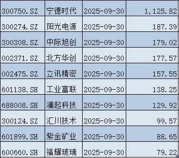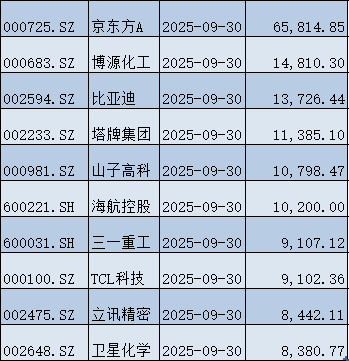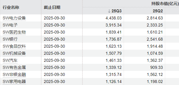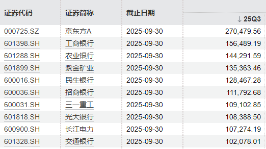 北向资金三季度持仓动向正式浮出水面。 10月15日,沪深港通信息披露机制调整后的三季度数据公布。Wind数据显示,截至今年三季度末,北向资金持有A股数量环比减少153.09亿股。不过,得益于三季度A股的行情回暖,北向资金持仓市值增加了2943.87亿元。 2024年4月,在两地证监会指导下,沪深港通交易信息披露机制进行调整。调整后每季度第5个沪深股通交易日公布上季度末单只证券沪深股通投资者合计持有数量及各香港结算参与者持有数量。 从持股数量看,截至今年三季度末,北向资金持股数量最高的股票为京东方A(000725),持股数量达到27.05亿股。 工商银行(601398)、农业银行(601288)、民生银行(600016)、招商银行(600036)、光大银行(601818)、交通银行(601328)等银行股,北向资金持股数量居前,分别达到15.65亿股、14.43亿股、12.85亿股、11.18亿股、10.84亿股、10.21亿股。 紫金矿业(601899)、三一重工(600031)、长江电力(600900)等股票,持股数量位居前十,分别为13.54亿股、10.91亿股、10.73亿股。 ![]() 从持股数量的相对变化看,三季度北向资金增持最多的股票同样为京东方A,增持数量达到6.58亿股。 博源化工(000683)、比亚迪(002594)、塔牌集团(002233)、山子高科(000981)、海航控股(600221)等股票,北向资金股份增持数量过亿,分别增持了1.48亿股、1.37亿股、1.14亿股、1.01亿股、1.02亿股。 三一重工(600031)、TCL科技(000100)、立讯精密(002475)、卫星化学(002648)等,三季度分别增持了9107.12万股、9102.36万股、8442.11万股、8380.77万股。 ![]() 而从持股市值方面看,截至三季度末,北向资金持仓市值最大的股票为宁德时代(300750),达到2656.59亿元,排名第一。 贵州茅台(600519)、美的集团(000333)的持股市值超过700亿元,分别达到881.42亿元、716.48亿元。 招商银行(600036)、北方华创(002371)、汇川技术(300124)的持股市值超过400亿元,分别达到451.75亿元、418.37亿元、405.95亿元。 紫金矿业(601899)、恒瑞医药(600276)的持股市值超过300亿元;长江电力(600900)、福耀玻璃(600660)的持股市值超过200亿元。 ![]() 而从持股市值的相对变化看,三季度宁德时代的持股市值增幅最大,达到1125.82亿元。今年第三季度,宁德时代股价涨幅高达59.96%,其间最低价为248.29元/股,最高价为408.88元/股。 阳光电源(300274)、中际旭创(300308)、北方华创、立讯精密、工业富联(601138)、澜起科技(688008)等股票,北向资金的持股市值增幅均超过百亿元,分别增加了187.39亿元、179.02亿元、177.57亿元、157.55亿元、138.25亿元、129.92亿元。 ![]() 行业方面,申万一级行业分类下,今年三季度,北向资金对银行、电子、非银金融、电力设备、有色金属的持股数量最大。其中,电子的持股数量增加最多,达到18.21亿股。基础化工、汽车、农林牧渔、建筑材料、环保、机械设备等行业,北向资金的持股增加数量均过亿。 持股市值方面看,今年三季度,北向资金对电力设备、电子、医药生物、银行、食品饮料的持股市值最大。其中,电力设备、电子的持股市值增幅最大,均超过千亿元,分别增加了1623.41亿元、1582.08亿元。 ![]() 展望后市,近期,多家外资机构均对中国股市前景给予了积极的判断。例如,瑞银中国股票策略研究主管王宗豪最新发表研报指出,鉴于当前市场形势,外部因素扰动下短期或出现一定获利回吐,但预计MSCI中国指数可能在74点水平附近得到有力支撑,预计将有更多投资者在市场回调时抄底,从而推动股指走高。 “尽管经贸摩擦的针对性增强,但市场或已适应博弈,并且,政策预期加强、资金入市潜力、人工智能应用提速以及估值盈利双支撑,这四大因素构成了我们的信心基础。”汇丰私人银行及财富管理中国首席投资总监匡正说。 路博迈基金首席策略师朱冰倩表示,四季度依然值得乐观,中期看多中国资产的理由依然坚实。