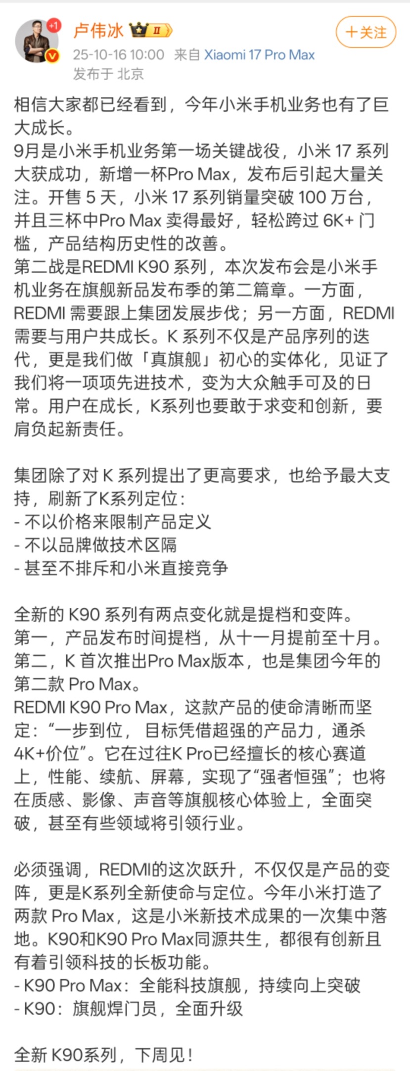 10月16日,小米集团合伙人、总裁、手机部总裁、小米品牌总经理卢伟冰在微博发文表示,9月是小米手机业务第一场关键战役,第二战是REDMI K90系列,集团除了对 K 系列提出了更高要求,也给予最大支持,不以价格来限制产品定义、不以品牌做技术区隔、甚至不排斥和小米直接竞争。