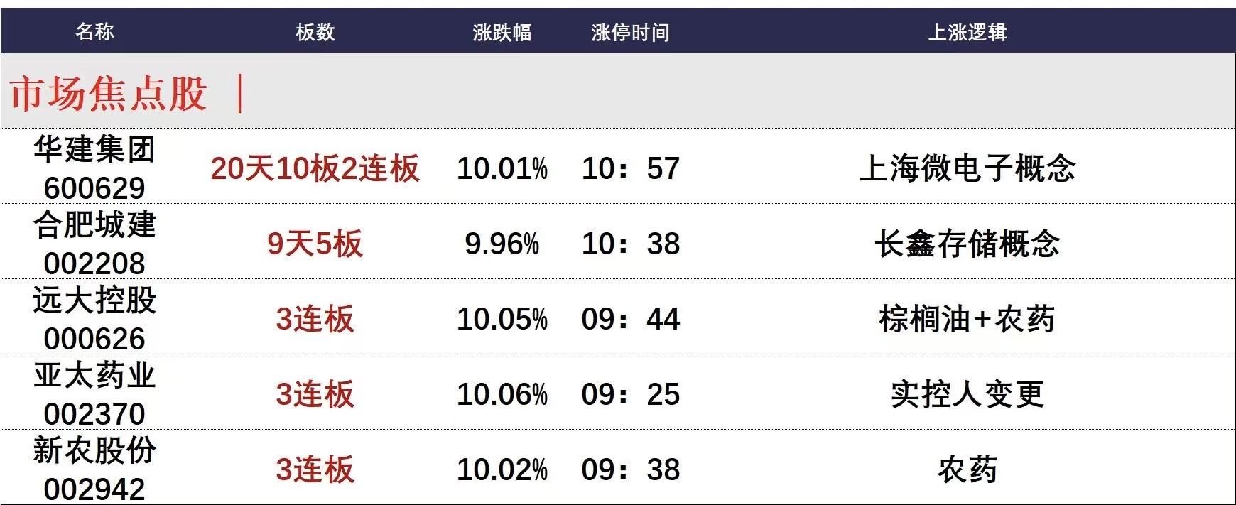 今日午盘全市场共34股涨停,连板股总数11只,16股封板未遂,封板率为68%(不含ST股、退市股)。焦点股方面,上海微电子概念股华建集团走出20天10板,存储芯片板块合肥城建9天5板、三孚股份2连板,棕榈油涨价概念远大控股3连板,实控人变更的亚太药业3连板,农药股新农股份3连板。