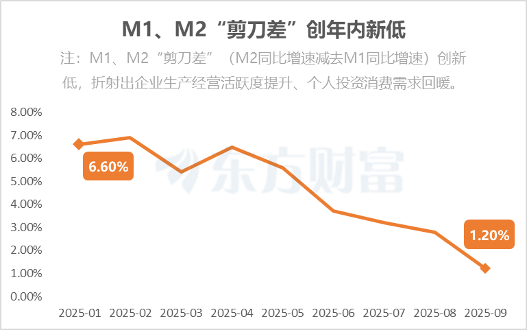 市场又有新变化! 10月16日早盘,A股市场上涨“面积”再度萎缩。早盘,全市场上涨个股一度不到1500只。从风格上来看,科技和红利皆有不错涨幅。反而小盘股再现异常低迷。这意味着,资金在向核心资产集中。 与此同时,市场的驱动力也有大变化。首先,M1、M2同比分别增长7.2%、8.4%,对应预期值为6.0%、8.5%,二者剪刀差较8月进一步收窄。其次,中国电商物流指数按月续升,继续刷新年内新高。那么,这些变量将如何演绎,对市场又有怎样的影响? 两大驱动力的变化 从内生动力来讲,A股市场的上涨动力正在发生变化。 首先,2025年9月金融数据显示,新增社融和人民币贷款虽同比小幅下滑,但整体仍高于市场预期,反映出信贷端在银行发力下具备一定韧性。2025年9月M2增速小幅回落至8.4%,较前值下降0.4个百分点;M1则快速回升至7.2%,较前值上升1.2个百分点。从A股的上涨逻辑来看,M1回升,一般都对应着权益市场上涨。 ![]() 但从金融数据变化的原因来看,国泰海通认为,M2回落主因政府债发行放缓削弱财政对货币总量的支撑,叠加人民币升值预期边际降温,企业结汇意愿下降。M1上涨则主要受低基数效应影响,2024年同期财政投放偏弱及存款定期化导致M1基数偏低;其次,化债背景下企业流动性改善,结汇意愿增强,对企业存款形成支撑。此外,此前“存款搬家”趋势趋缓,部分资金回流银行体系,居民存款同比多增7600亿元,亦推动M1回升。 另一方面,中国物流与采购联合会公布9月份中国电商物流指数。中国电商物流指数按月续升,继续刷新年内新高。9月份中国电商物流指数为112.7点,较8月上升0.4点,再创年内新高。9月份,电商物流总业务量指数为132.5点,较8月上升1.1点。这意味着经济的内生动力仍在增强。 分地区看,除东部地区外,其他地区均有所回升,中部地区涨幅最大,电商物流总业务量指数较8月上升3.5点。随着县乡村三级物流寄递体系的不断完善,农村电商物流业务量今年也持续上升,9月份电商物流农村业务量指数升幅明显。9月份,农村电商物流业务量指数为132.7点,按月回升1.0点,也创年内新高。