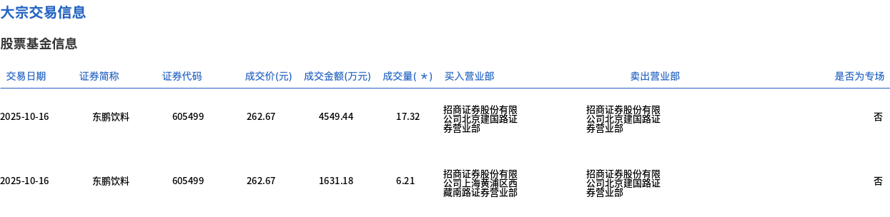 10月16日,东鹏饮料大宗交易成交23.53万股,成交额6180.62万元,占当日总成交额的11.09%,成交价262.67元,较市场收盘价297.9元折价11.83%。