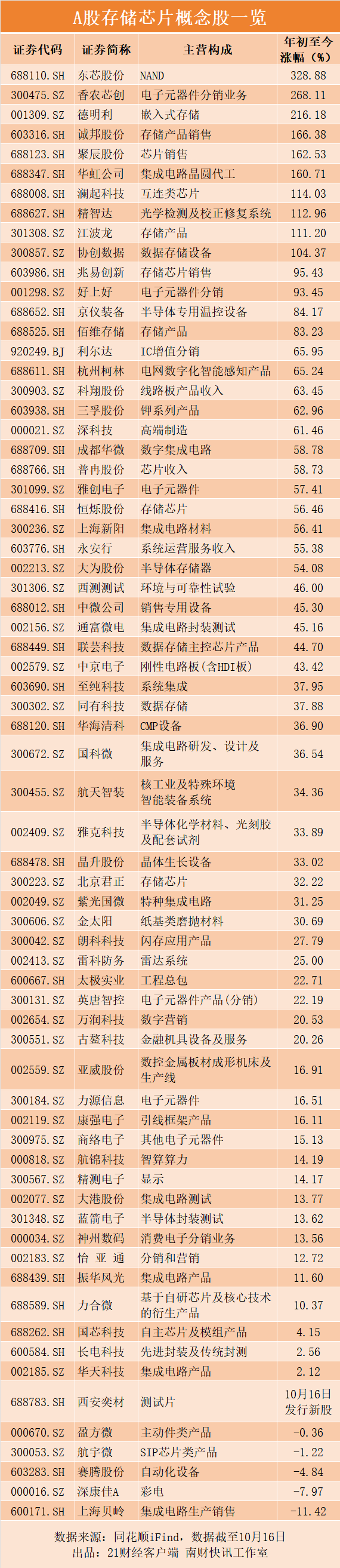 10月16日,存储芯片板块再度走强,香农芯创(300475.SZ)一度20CM涨停创出新高。截至收盘,存储芯片指数(861499.EI)涨1.22%,个股方面,德明利(001309.SZ)、三孚股份(603938.SH)等涨停,香农芯创涨超16%,佰维存储(688525.SH)、蓝箭电子(301348.SZ)、雅创电子(301099.SZ)、江波龙(301308.SZ)等涨超5%。 ![]() 产业端,全球存储产品涨价潮持续,机构预测四季度存储市场将继续火热。CFM闪存市场发布的《2025年四季度存储市场展望》显示,预计四季度企业级SSD(eSSD)价格涨幅将达到10%以上,DDR5 RDIMM价格涨幅约10%~15%。此前的9月,闪迪(Sandisk)、美光、三星、西部数据等多家存储巨头已先后发布提价通知。 多家机构指出,全球存储产品涨价潮下,国内厂商将迎业务机遇。申万宏源证券认为,海外原厂转向高盈利产品,传统、利基存储涨价行情有望延续,国产厂商有望承接转单与利基市场。国信证券也表示,在产业回暖背景下,手机、服务器市场打开国产化空间,国产存储厂商有望迎来量价齐升机遇期。 “量价齐升”市场预期下,A股存储芯片产业链公司股价一路飙升。年初至今,东芯股份涨超3倍,香农芯创、德明利涨超2倍,诚邦股份、聚辰股份、华虹公司、澜起科技、江波龙、协创数据、兆易创新等多只个股实现股价翻番。 市场火热下,展望后市,哪些机会值得关注? 国信证券认为,存储芯片处于涨价周期,同时需求量受益于AI拉动,推荐国产存储厂商江波龙、德明利、佰维存储、兆易创新等。 东海证券则提醒,目前市场资金热度相对较高,建议不宜追高、逢低缓慢布局,建议关注:海内外需求强劲的AIOT领域公司;AI创新驱动的算力芯片、光器件公司;上游供应链的半导体设备、零组件、材料厂商,以及价格触底复苏的龙头标的。