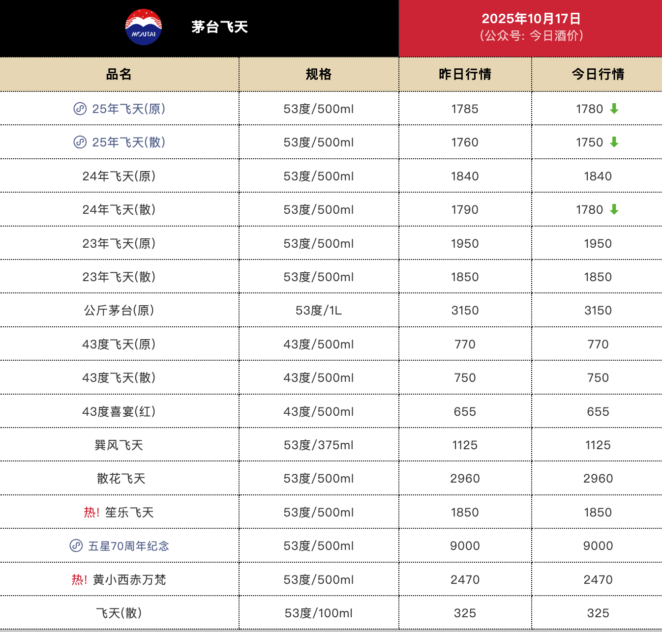 今日酒价披露的批发参考价显示,10月17日,25年飞天茅台原箱较前一日下跌5元,报1780元/瓶;25年飞天茅台散瓶较前一日下跌10元,报1750元/瓶。24年飞天茅台原箱较前一日持平,报1840元/瓶;24年飞天茅台散瓶较前一日下跌10元,报1780元/瓶。