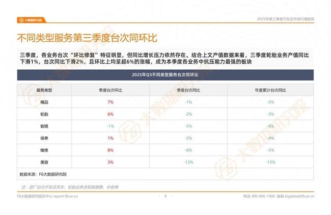 三、不同类型服务第三季度台次同环比 三季度,各业务台次“环比修复”特征明显,但同比增长压力依然存在。 结合上文产值数据来看,三季度轮胎业务产值同比下滑1%,台次同比下滑2%,且环比上均呈超6%的涨幅,成为本季度各业务中抗压能力最强的板块。
