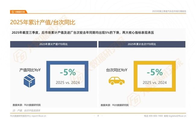 F6大数据研究院发布《2025年第三季度汽车后市场行情报告》:年度产值与台次同比双下滑5%,刹车片、机油、机油滤清器、空气滤清器、空调滤清器、自动变速箱油全域面临销量下滑压力。