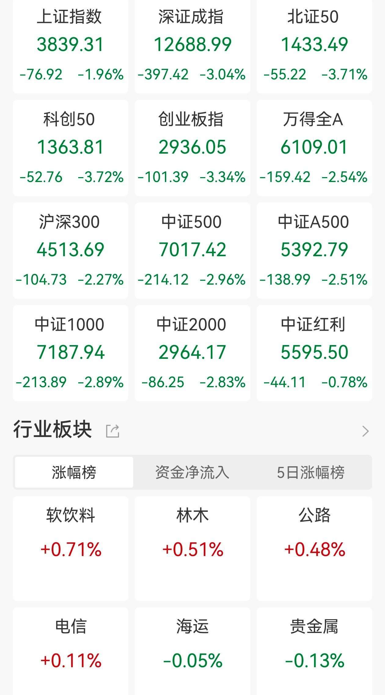 格隆汇10月17日|A股主要指数今日集体下挫,截至收盘,沪指跌1.95%报3839点,深证成指跌3.04%,创业板指跌3.36%,科创50指数跌3.77%,北证50指数跌3.75%。全市场成交额1.95万亿元,较前一交易日增量57亿元,近4800股下跌。