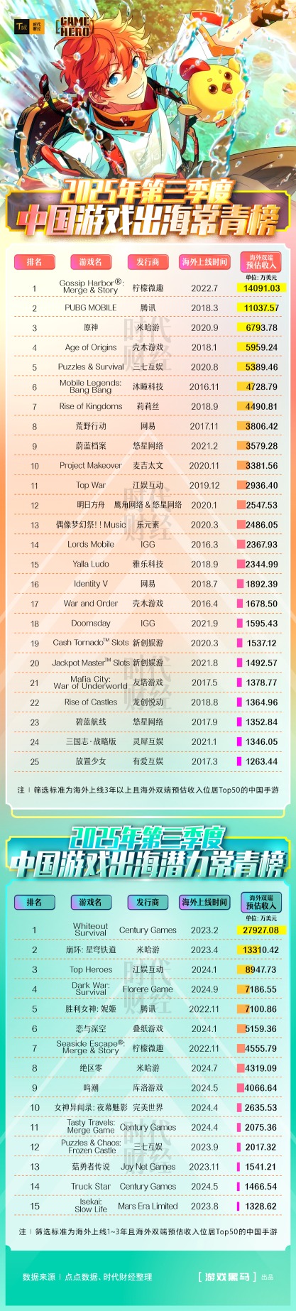 中国游戏出海三季报:《Gossip Harbor》登顶常青榜 世纪华通旗下3款游戏跻身潜力常青 专业金融数据,下一代智能终端 今年三季度,中国游戏出海整体依旧保持强劲势头,头部与腰部厂商纷纷在海外刷新战绩。 然而,面对早已是一片红海的游戏出海市场,如何让出海产品实现长线运营,仍是所有厂商必须直面的长期考验。 时代财经以海外上线3年以上且海外双端预估收入跻身Top50的中国手游为筛选标准,统计并发布《2025年第三季度中国游戏出海常青榜》(下称“《出海常青榜》”);同时以海外上线1年至3年且海外双端预估收入跻身Top50的中国手游为标准,统计并发布《2025年第三季度中国游戏出海潜力常青榜》(下称“《出海潜力常青榜》”)。 据统计,三季度共有《Gossip Harbor®: Merge & Story(下称“Gossip Harbor”)》《PUBG MOBILE》《原神》等25款游戏入围《出海常青榜》,数量较上半年持平;同时,有《Whiteout Survival》《崩坏:星穹铁道》《Top Heroes》等15款游戏入围《出海潜力常青榜》,数量较上半年增加1款。 ![]() 7款手游海外月均收入破亿元 据时代财经统计,此次入围《出海常青榜》的25款手游2025年第三季海外双端预估收入累计约为9.08亿美元,以中国外汇交易中心10月13日14:50披露的人民币兑美元成交价7.1309计算,约合人民币64.78亿元;其中7款手游海外双端月均预估收入超过人民币1亿元。 从游戏企业角度来看,悠星网络旗下游戏入围最多,达到3款;网易(NTES;09999.HK)、神州泰岳(300002.SZ)旗下壳木游戏、IGG(00799.HK)、新创娱游各有2款游戏入围,呈现出中小厂商与大厂并肩出海、各显神通的格局。 具体来看,位居前三的是《Gossip Harbor》《PUBG MOBILE》《原神》3款出海热门手游,今年第三季度海外双端预估收入分别达到1.41亿美元(约为10.05亿元)、1.1亿美元(约为7.87亿元)、6793.78万美元(约为4.84亿元)。 《Gossip Harbor》是柠檬微趣旗下2022年7月在海外上线的一款女性向剧情合成手游,上线仅三年首次入榜便登顶榜首。自上线以来,该游戏凭借强剧情驱动与高频内容运营,在海外市场取得了稳定的成绩,并在今年三季度迎来三周年庆典,推出了相关庆祝活动,进一步提升了玩家的参与度和活跃度,继续维持其在合成品类中的领先地位。 而作为腾讯(00700.HK)旗下的“吃鸡”手游国际服,《PUBG MOBILE》上线七年多仍稳居全球大逃杀类射击手游之首,今年三季度先后开启3.9版本和4.0版本,推出变形金刚联动、夏日大混战、“绯月异变”、幽灵派对排位联动等主题玩法,进一步带动老用户回流和付费双涨。 米哈游旗下ARPG手游《原神》在今年三季度迎来了五周年庆典,并凭借周年庆版本的更新,推出全新地图、新角色、抽卡与圣遗物保底改革以及大量减负优化,实现爆发,排名稳居《出海常青榜》第三位。 其后,《Age of Origins》《Puzzles & Survival》2款出海热门手游三季度海外双端预估收入均超过5000万美元,分别为5959.24万美元(约为4.25亿元)、5389.46万美元(约为3.84亿元),稳居《出海常青榜》前五。 壳木游戏旗下末日题材策略(SLG)塔防手游《Age of Origins》在今年三季度依然保持了高频率的版本更新节奏,不断丰富全新Roguelite(肉鸽)式3D战争策略玩法,引入“战术指令卡”系统,强化即时策略体验,新增“高地工事”“洼地伏击”两种可占领地形,同时通过荣誉排名与6星军官系统进一步拉大长线养成深度,并针对采集、治疗等痛点做了减负优化。 三七互娱(002555.SZ)旗下融合休闲三消玩法的SLG手游《Puzzles & Survival》在今年三季度也迎来了五周年庆典,上线了“5th Anniversary”主题庆祝活动,包括限时海滨嘉年华和全新剧情任务,玩家可与角色Alexander一起参与狂欢派对。8月底,《Puzzles & Survival》还推出七夕文化主题版本,将乞巧文化代表性符号“七娘盘”作为核心元素植入,玩家参与限时节日活动即可将其作为藏品收入囊中,以沉浸式体验让全球用户感受东方乞巧文化魅力。 三七互娱集团董事、高级副总裁程琳对时代财经表示,三七互娱一直在走多元化和精品化的路线,所以题材包括玩法都在不断迭代。此外,更关键的还是对于用户需求的精准把握;同时,潜移默化地进行了很多中国文化元素植入,既增强了用户粘性,也让海外玩家对中国游戏有了更深层的认知。此外,AI技术对游戏出海也有极大的帮助。 出海潜力常青再扩容 在上述25款2025年第三季度出海常青游戏之外,时代财经在统计过程中发现,已有不少出海游戏展现出成为常青的潜力。它们普遍在海外上线超过一年之后,依旧维持着稳定的流水表现,能在激烈的市场竞争之中,持续跻身海外双端预估收入Top50的中国手游行列。 据时代财经统计,今年第三季度共有15款游戏进入《出海潜力常青榜》,数量较上半年增加1款、较一季度增加3款。其中,世纪华通(002602.SZ)旗下Century Games表现亮眼,有3款游戏入围;米哈游旗下有2款游戏入围;腾讯、三七互娱、完美世界(002624.SZ)、叠纸游戏、库洛游戏、江娱互动、Florere Game、柠檬微趣、Joy Net Games等厂商各有1款游戏入围。 具体来看,Century Games旗下4X策略手游《Whiteout Survival》海外收入依然遥遥领先,今年第三季度海外双端预估收入约达2.79亿美元(约为19.91亿元)。今年三季度,《Whiteout Survival》进行了多次内容更新,先后上线了王国移民、霜龙霸主、除雪小分队等活动,新增专家系统、强盛荣耀系统、尊享特权等功能,使其在全球市场的热