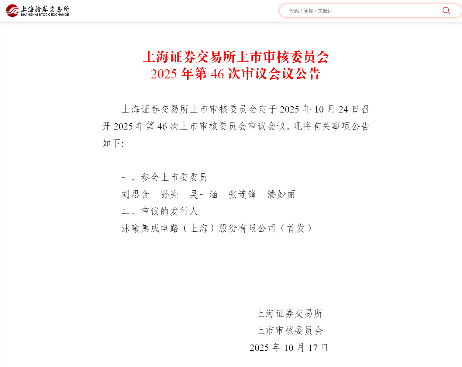 上交所上市审核委员会10月17日公告,定于2025年10月24日召开2025年第46次上市审核委员会审议会议,审议沐曦集成电路(上海)股份有限公司首发事项。