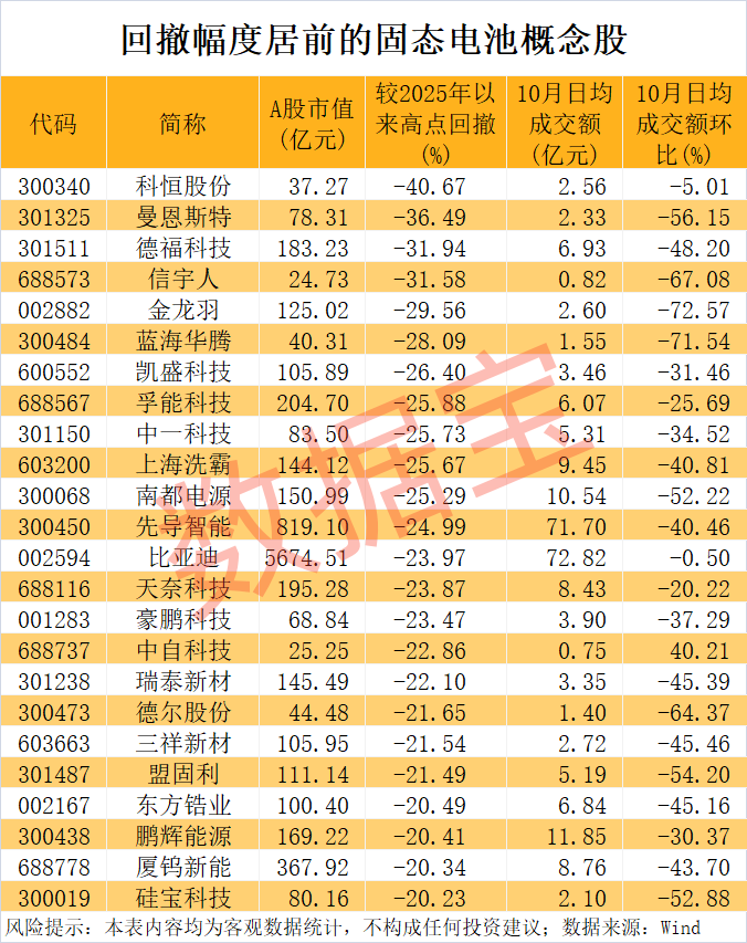 近期随着A股市场热度下降,不少固态电池牛股出现明显回落。10月17日收盘价与年内高点相比,24股回撤幅度超20%,德福科技、中一科技、上海洗霸、先导智能等年内翻倍牛股名列其中。回撤较大的还有科恒股份、曼恩斯特、信宇人、金龙羽、东方锆业等。