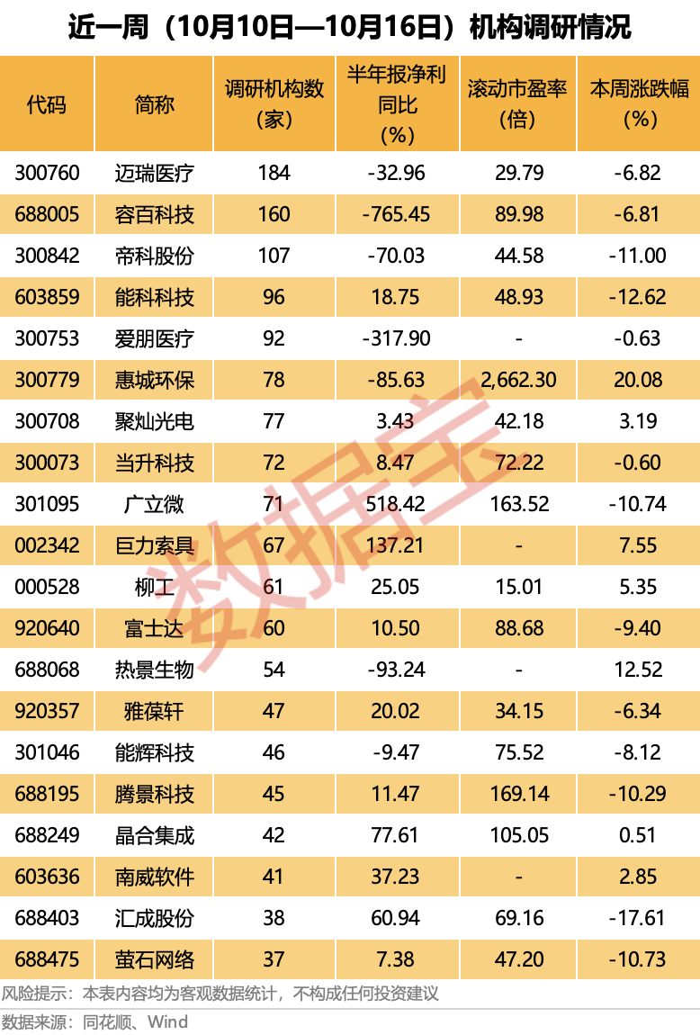 近一周机构调研个股有近200只,迈瑞医疗的调研机构数最多。 迈瑞医疗近一周获184家机构调研,其中包括14家基金公司、8家证券公司、7家私募公司、7家保险公司以及多达124家海外机构等。 公司在调研中表示,本次境外发行上市的目的主要有以下四个方面:强化国际影响力,匹配全球化发展战略,全球员工激励和人才吸引,构建全球化资本平台以及进一步优化股东结构和流动性。 另外,公司预计2025年第三季度整体营业收入将实现同比正增长,同时延续收入金额逐季度环比改善的趋势。分区域来看,国际市场的业务进度基本符合公司预期,预计从第三季度开始增长将有所提速。随着持续深入的本地化平台建设,国际收入占整体营收的比重将进一步提升,其中发展中国家将维持快速增长的趋势。虽然国内市场医疗设备招标自去年12月开始复苏,但由于从公开招标到收入确认的周期被显著拉长,因此从第三季度开始,国内市场将有所改善。总体来看,公司将于第三季度如期迎来拐点。 ![]() 容百科技、帝科股份等个股获超100家机构调研。 容百科技在调研中表示,公司拥有众多行业头部客户,除了宁德时代、孚能科技、亿纬锂能等国内客户外,海外客户开发也取得了重大进展,包括松下等日韩头部电芯厂以及北美客户。公司具备健全的海外客户结构,海外产能能够在国内相关政策下正常运行并发挥作用,包括韩国产能和波兰产能,这些产能的稀缺性会进一步上升。 帝科股份(300842)近期发布公告,拟以3亿元现金收购江苏晶凯半导体技术有限公司(以下简称“江苏晶凯”)62.5%股权。本次交易完成后江苏晶凯将成为公司的控股子公司,并纳入合并报表范围。 在调研中公司透露,江苏晶凯专注于存储芯片封测以及存储晶圆测试服务,目前主要客户是上市公司旗下子公司因梦控股,此外还有成都电科星拓等,在配套协同因梦控股业务需求同时积极拓展其他客户封测业务。江苏晶凯封装产能约3KK/月、测试产能约2.5KK/月(规划将扩产至4KK/月)。 ![]() 从市场表现来看,近一周机构调研股平均下跌近4%,惠城环保、骄成超声、热景生物、梅雁吉祥等个股均逆市涨逾10%。 超级牛股惠城环保(300779)2022年低点以来一度暴涨近30倍,本周累计涨幅超20%。公司在调研中透露,20万吨/年混合废塑料资源化综合利用项目于7月11日进行首次投料,一次性投料成功,工艺得到验证。8月进行第二次试生产过程中,发现了油气管线设计的一些问题,后续通过技术升级改造,于9月29日顺利复产。复产产出的塑料裂解轻油产品经第三方专业机构检测,指标符合预期标准,并交付下游客户。目前装置处于持续稳定生产状态。公司已建设加氢装置,未来可持续提高产品品质。 骄成超声透露,在半导体封测环节,核心超声波设备国产化率较低,进口设备如K&S、ASM、德国 PVA、美国 Sonoscan在超声波键合机、超声波扫描显微镜等领域占有较高市场份额。公司凭借自身在超声波行业多年的技术积累,紧跟国内半导体产业升级发展需求和技术发展趋势,逐渐打破行业内外资竞争对手的垄断局面,市场份额呈逐渐上升的趋势。 热景生物在调研中表示,公司参股公司舜景医药开展的创新药SGC001注射液临床进展顺利,分别在健康志愿者中和在前壁ST段抬高型心肌梗死患者中开展了2个I期研究,在健康志愿者中开展的Ia期临床研究已顺利完成,并于8月27日完成临床研究的揭盲。初步分析显示,在前壁ST段抬高型心肌梗死患者中,SGC001不同剂量组的初步疗效结果与预期相符,目前正在进行统计分析及研究报告的总结工作,具体研究数据有待正式报告完成后揭晓。公司计划于近期I期研究结束后,正式启动Ⅱ期临床研究。 ![]()