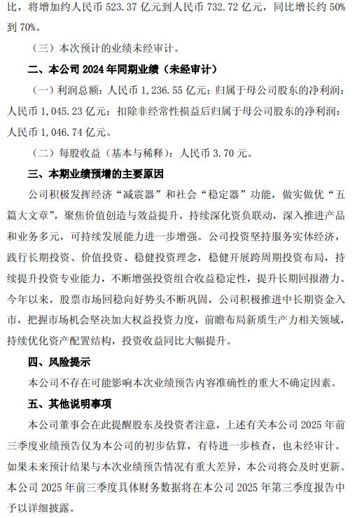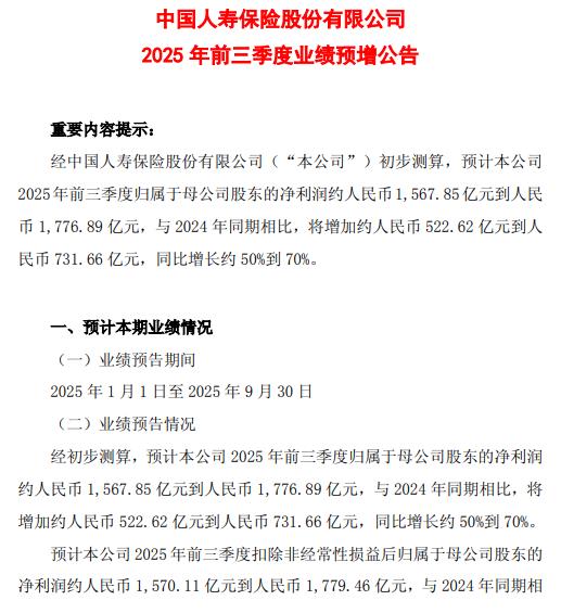 中国人寿(601628)10月19日发布业绩预告,预计2025年前三季度归属于母公司股东的净利润约1567.85亿元到1776.89亿元,同比增长约50%到70%。报告期内,股票市场回稳向好势头不断巩固,公司积极推进中长期资金入市,把握市场机会坚决加大权益投资力度,前瞻布局新质生产力相关领域,持续优化资产配置结构,投资收益同比大幅提升。
