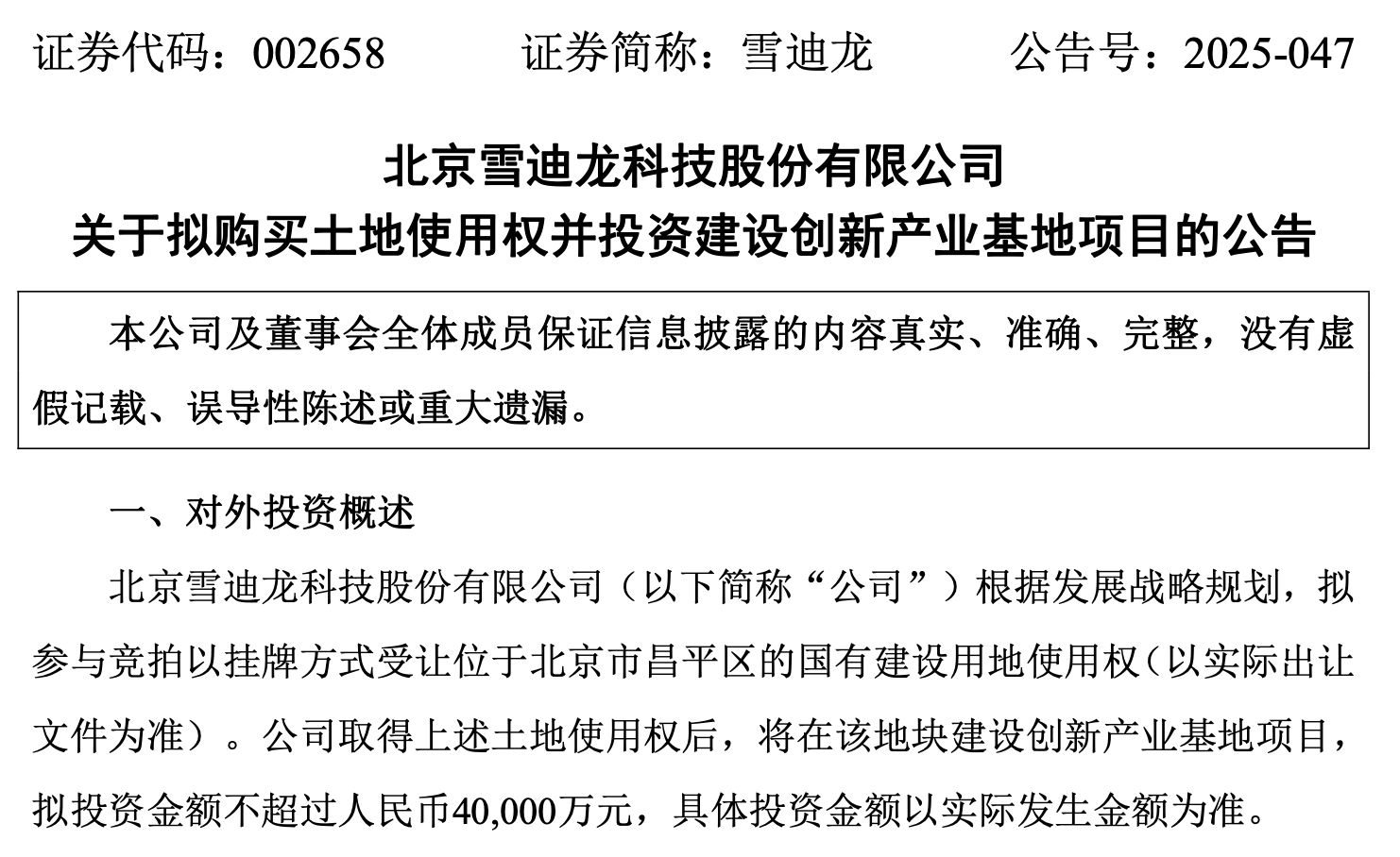 雪迪龙拟砸4亿“拿地”建设创新产业基地 此前首次减持回购股份获资783万