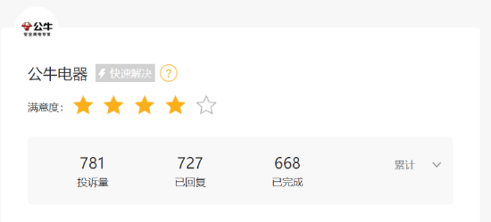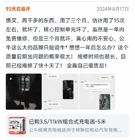 《BUG》栏目在黑猫投诉 【下载黑猫投诉客户端】上发现,针对公牛电器新能源产品的投诉不在少数,有的随车充在使用半年后出现过温断电的问题;还有的充电桩使用一个月就出现了充电异常断充现象;还有用户购买了两个充电桩连续出现故障,一个烧坏了,还有一个充不进电。 在公牛汽车用品淘宝旗舰店中,也有不少对其产品质量和服务的差评。有用户评价称,“慎买,两千多的东西,用了三个月核心控制单元坏了,虽然是一年免费维修,但三个月就坏,用得真不安心”,还有用户表示,“插头再次出现故障,已经给我寄过一根,但再次出现过热保护自动断电。一个插头都做不好,如何相信公牛的质量?”