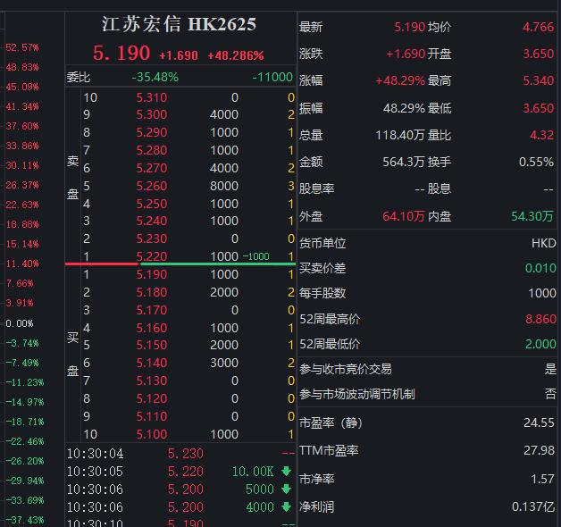 截至10时40分,江苏宏信上涨48.28%,报5.19港元。