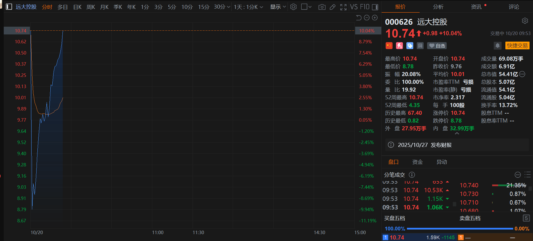 格隆汇10月20日|远大控股(000626)盘中大幅波动,上演“天地天板”,现报10.74元,成交额6.15亿元。