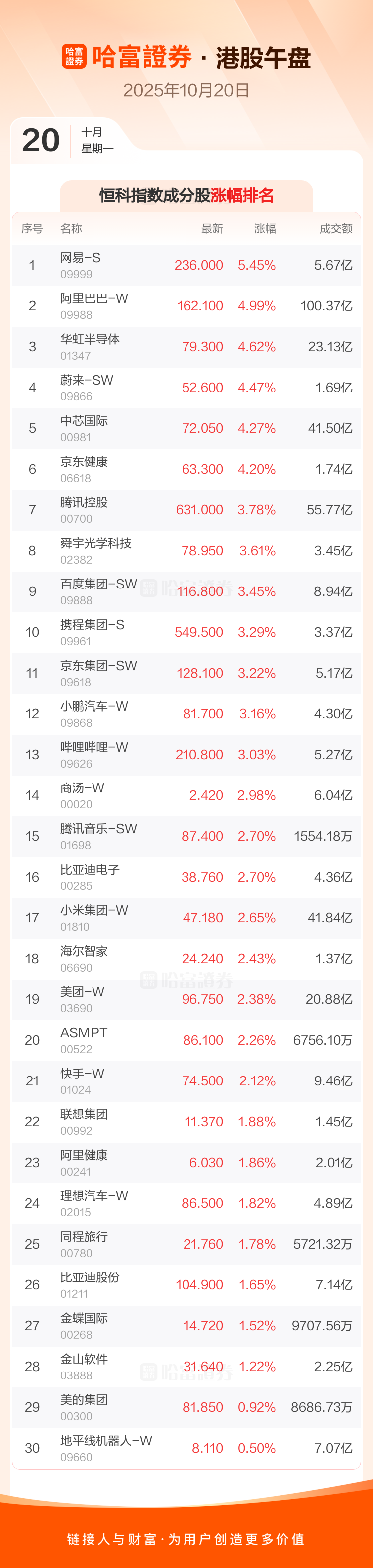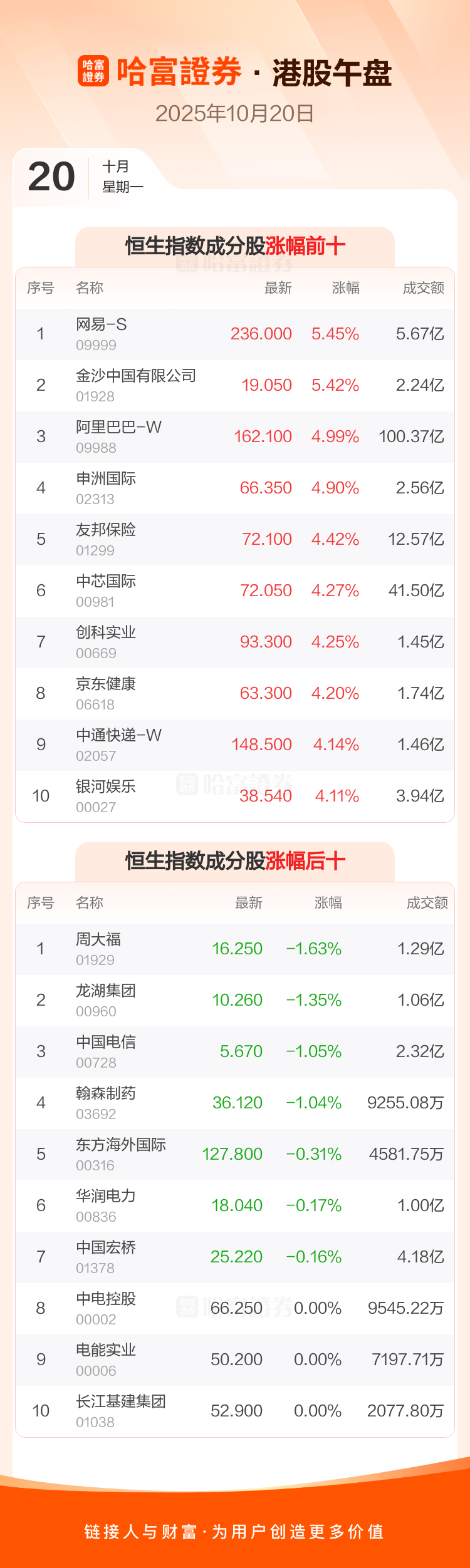 港股10月20日午盘走高,恒生指数收报25854.98点,涨607.88点,涨幅2.41%;恒生科技指数收报5945.11点,涨184.73点,涨幅3.21%。恒生指数成分股中网易-S、金沙中国有限公司、阿里巴巴-W涨幅居前,周大福、龙湖集团、中国电信跌幅靠前。恒生科技指数成分股中网易-S、阿里巴巴-W、华虹半导体涨幅居前。
