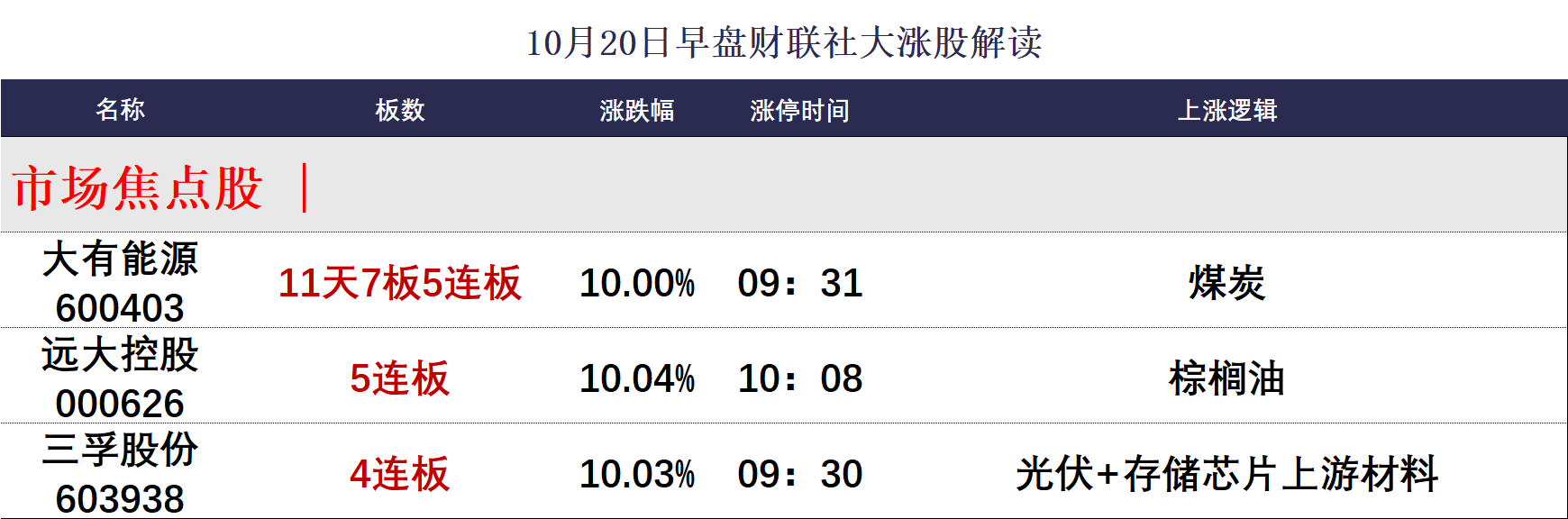 今日午盘全市场共57股涨停,连板股总数9只,18股封板未遂,封板率为76%(不含ST股、退市股)。焦点股方面,煤炭板块持续活跃,大有能源5连板、安泰集团3连板,棕榈油概念股远大控股晋级5连板,存储芯片上游材料的三孚股份走出4连板。