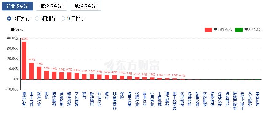 行业板块呈现普涨态势,煤炭行业、燃气、非金属材料、电机、航空机场、通信服务、电池、通信设备、消费电子板块涨幅居前,贵金属板块逆市重挫。
