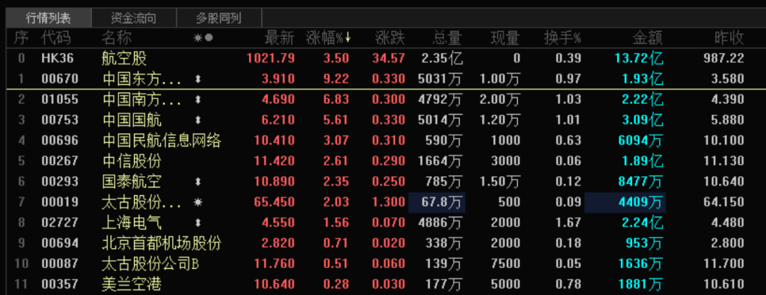 航空股集体“起飞”! 今日午后,港股航空股持续走高,中国东方航空股份一度涨超10%,中国南方航空股份一度涨超7%,中国国航涨超5%,国泰航空跟涨。东方航空、南方航空、华夏航空等A股也是集体拉升。 有机构认为,新航季时刻数同比持续收紧,景气呈现底部好转迹象,叠加“反内卷”和低基数,票价同比转正有望在四季度延续,同时油价下跌有望降低航司成本压力,共同改善航司盈利。此外,人民币升值也有利于航空板块,并催化板块关注度。 突然大涨 航空股悄然大涨。今日午后,港股市场航空股板块大涨达3.5%,板块个股亦是全线上扬。截至A股收盘,中国东航、南方航空、华夏航空、海航控股、中国国航等亦涨幅显著。 ![]() 值得注意的是,交运板块今天整体涨幅不错。除了航空股,港口运输也表现出色。港股市场中远海能一度涨超9%,太平洋航运大涨超4%,中国外运也有不错涨幅。而A股交运板块更是于尾盘拉升。安通控股、海汽集团、永泰运、海通发展等涨幅较大。 ![]() 消息面上,近期民航局公布2025冬春航季时刻计划表,从10月26日起正式实施,国内线时刻连续两个航季同比收缩,2024年、2025年降幅分别为1.0%、1.8%。 国内航线扣油平均票价增长5.9%,日均客座率87.9%,比2024年同期日均增加3.5个百分点。同时,国际市场也迎来暑运后的高峰。中外航空公司日均执行国际客运航班超过2000班,比2024年国庆假期增长10.6%。在此票价和客座率水平下,航司盈利较2024年同期明显改善。 另外,10月15日起,MSC、达飞、赫伯罗特等全球航运巨头集体涨价,远东至欧洲、非洲、南美等多条航线运价上调600-2000美元/箱。航运业结束数月低迷,进入结构性上升周期。分析人士认为,本轮涨价背后,是欧美港口运力收缩、红海非洲航线调整、全球制造业补库存三重因素叠加。 多重利好驱动 9月三大航运营表现与行业相似,供给同比增长3.0%,相比暑运的5.1%小幅放缓,客座率同比提升2.7个百分点至85.6%,相比7—8月暑运旺季提升0.9个百分点。分航线看,暑运后国际线运力投放降低幅度更大,国内、国际线ASK分别同比增长1.6%、7.2%(暑运为2.8%、12.3%),客座率均表现良好,国内、国际线分别同增2.3、3.7个百分点至86.6%、83.7%。分航司看,东航在三大航中客座率依旧表现最好,同增4.1个百分点至87.6%,国航和南航客座率分别同比增长3.5个百分点、0.8个百分点至83.2%、86.3%。 或受益于公商务需求回暖,收益水平近期同样有所提高。根据航班管家数据,第36周—41周(9月1日—10月12日)国内线含油票价转正,同增3.0%(7—8月同比下降6.5%)。另外受益于行业“反内卷”以及航司收益管理不断精进,叠加基数较低,华泰证券认为,收益水平的提高有望在四季度及之后延续。同时油价下跌有望降低成本压力,有助于航司兑现盈利弹性。 此外,人民币升值也是一大助力。上周人民币兑美元中间价上调突破7.1大关,创逾11个月新高。分析人士认为,人民币近期升值主要受益于美联储降息预期增强及美元指数走弱,同时国内稳经济政策密集出台,为汇率稳定提供了坚实基础。中美贸易争端升级削弱了美元的传统避险属性,导致市场对美元信心下滑,也使得人民币相对走强。10月,美联储降息预期已经很强,可能为人民币提供持续支撑。