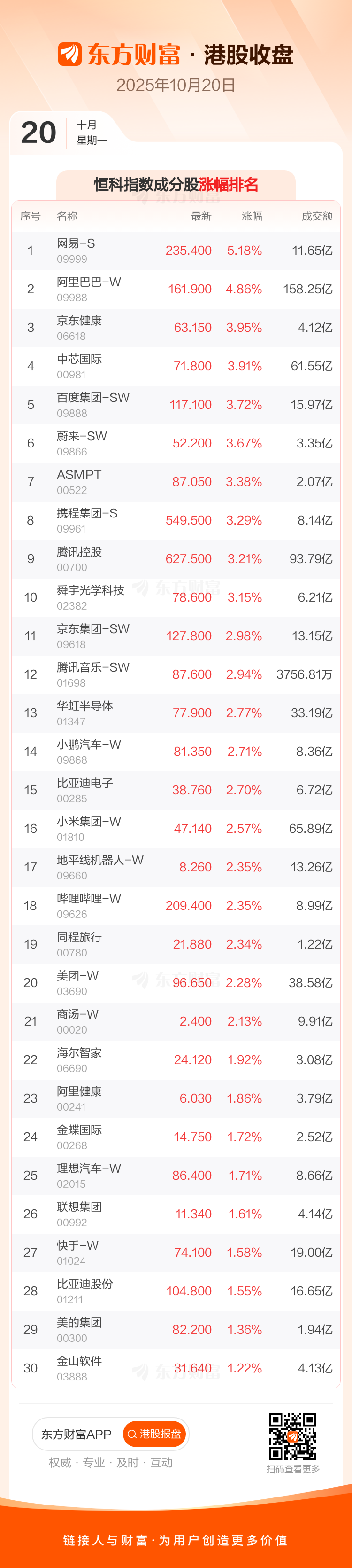 港股10月20日收盘走高,恒生指数收报25858.83点,涨611.73点,涨幅2.42%;恒生科技指数收报5933.17点,涨172.79点,涨幅3.0%。恒生指数成分股中网易-S、中国石油股份、阿里巴巴-W涨幅居前,龙湖集团、泡泡玛特、东方海外国际跌幅靠前。恒生科技指数成分股中网易-S、阿里巴巴-W、京东健康涨幅居前。