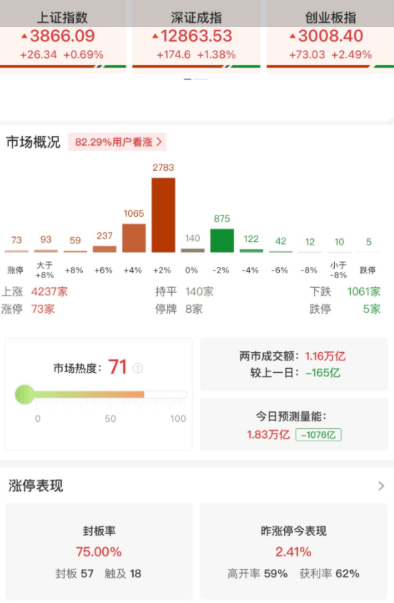 格隆汇10月20日|A股三大指数早盘集体反弹,截至午盘,上证指数涨0.69%报3866.09点,深成指涨1.38%,创业板指涨2.49%,北证50涨0.42%。沪深京三市半日成交额11709亿元,较上日缩量181亿元,全市场超4200只个股上涨。