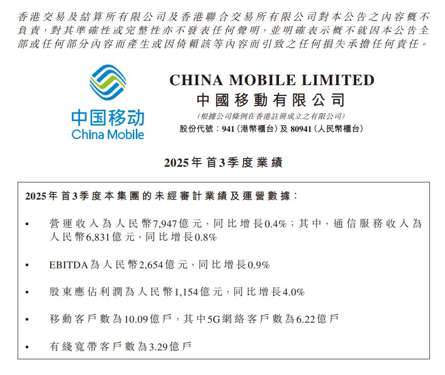 10月20日晚间,中国移动在港交所公告,2025年首三季度,集团营运收入为人民币7,947亿元,同比增长0.4%;其中,通信服务收入为人民币6,831亿元,同比增长0.8%。EBITDA为人民币2,654亿元,同比增长0.9%。股东应占利润为人民币1,154亿元,同比增长4.0%。移动客户数为10.09亿户,其中5G网络客户数为6.22亿户。有线宽带客户数为3.29亿户。