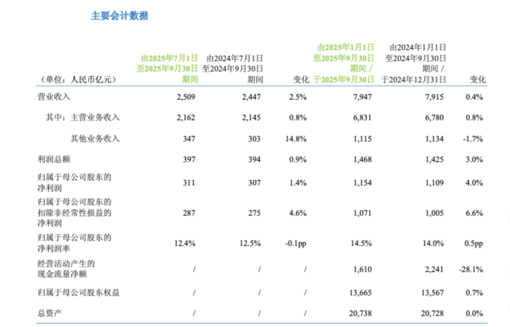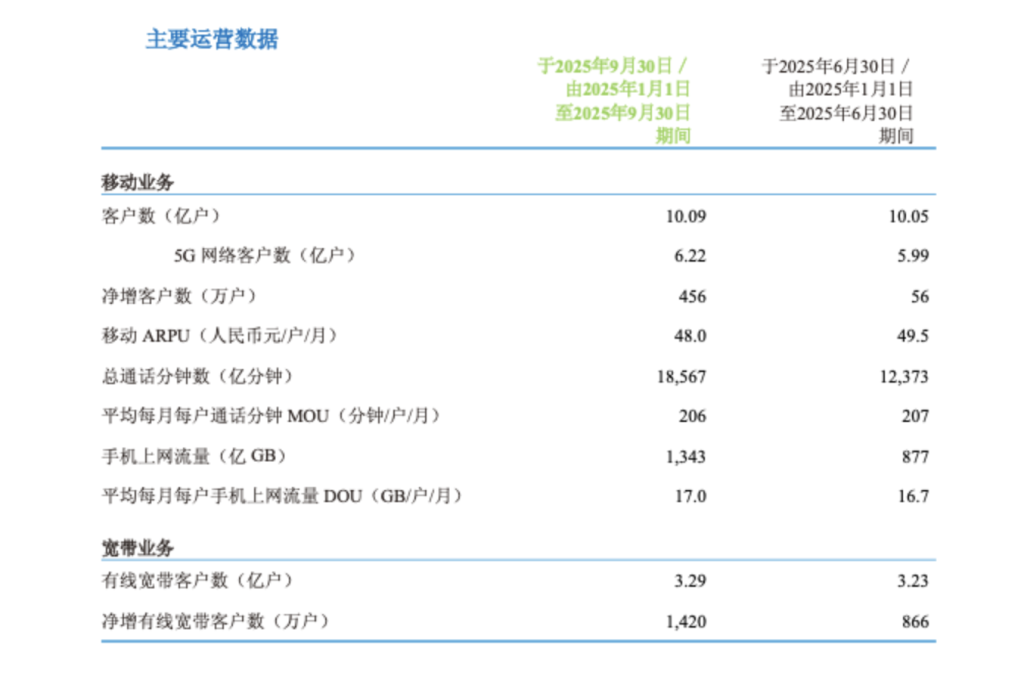 专业金融数据,下一代智能终端 中国移动前三季度营收近8000亿元,5G网络客户数突破6.22亿户,较6月末净增2300万户。 10月20日,中国移动(600941.SH,0941.HK)发布的报告显示,公司2025年前三季度营业收入为7947亿元,同比增长0.4%,其中,主营业务(通信服务)收入为6831亿元,同比增长0.8%,是营收增长的核心支柱;销售产品收入及其他为1115亿元,同比下降1.7%。归属于母公司股东的净利润为1154亿元,同比增长4.0%,归属于母公司股东的净利润率为14.5%,同比增长0.5个百分点。 ![]() 第三季度表现方面,中国移动营收2509亿元,同比增长2.5%,其中主营业务收入为2162亿元,同比增长0.8%,其他业务收入为347亿元,同比增长14.8%。归属于母公司股东的净利润为311亿元,同比增长1.4%,归属于母公司股东的净利润率为12.4%,较上年同期微降0.1个百分点。 个人市场方面,截至2025年9月30日,移动客户总数达10.09亿户,较2025年6月末净增456万户;其中5G网络客户数突破6.22亿户,较6月末净增2300万户。前三季度手机上网流量同比增长8.3%,平均每月每户手机上网流量(DOU)达17.0GB,同比增长8.1%;移动平均每月每用户收入(ARPU)为48元。 ![]() 家庭市场方面,有线宽带客户总数达3.29亿户,前三季度净增1420万户;家庭宽带客户达2.88亿户,前三季度净增976万户,家庭客户综合ARPU为44.4元。 政企与新兴市场方面,DICT业务收入保持良好增长,AI直接收入实现高速增长;新兴市场方面,国际业务收入快速增长,重点产品客户规模稳健提升。 新兴市场方面,中国移动称,积极把握高水平对外开放机遇,发挥国内国际市场联动效应,加快培育国际业务增长新动能,前s季度国际业务收入保持快速增长;持续深化“内容+科技+融合创新”运营,重点产品客户规模实现稳健增长。 截至报告期末,中国移动普通股股东总数为15万户,其中A股14.3万户,较2025年6月30日增加5.95万户,增幅71.3%,港股7504户。 据大智慧VIP,截至10月20日收盘,中国移动跌0.14%,报107.78元/股;港股方面,中国移动涨1.29%,报86.4港元/股。 (文章来源:澎湃新闻) |